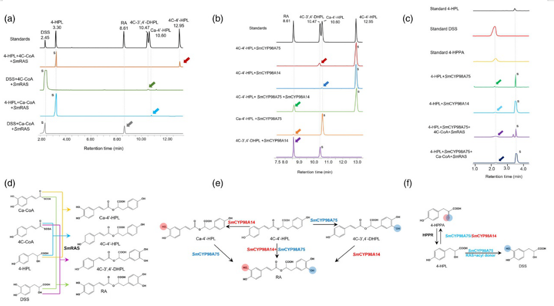 上述研究表明SmCYP98A75負(fù)責(zé)RA生物合成中?;荏w部分的 C-3′羥基化,因此作者推測SmCYP98A 酶可能在丹參素DSS形成中發(fā)揮重要作用。體外酶活實(shí)驗(yàn)表明,當(dāng)SmCYP98A75或SmCYP98A14與4-HPL一起孵育時,在產(chǎn)物中檢測到4-HPPA,說明這兩種酶表現(xiàn)出將4-HPL的側(cè)鏈羥基直接氧化為酮的能力。然而,在兩個反應(yīng)系統(tǒng)中均未檢測到DSS。作者認(rèn)為植物內(nèi)部生物合成環(huán)境是復(fù)雜的,包括許多代謝途徑和催化酶,在反應(yīng)體系中加入?;w和SmRAS,以模擬丹參的DSS生物合成。與SmRAS和4C-CoA或Ca-CoA孵育后,僅在SmCYP98A75催化的反應(yīng)中產(chǎn)生DSS(圖3c,f)。