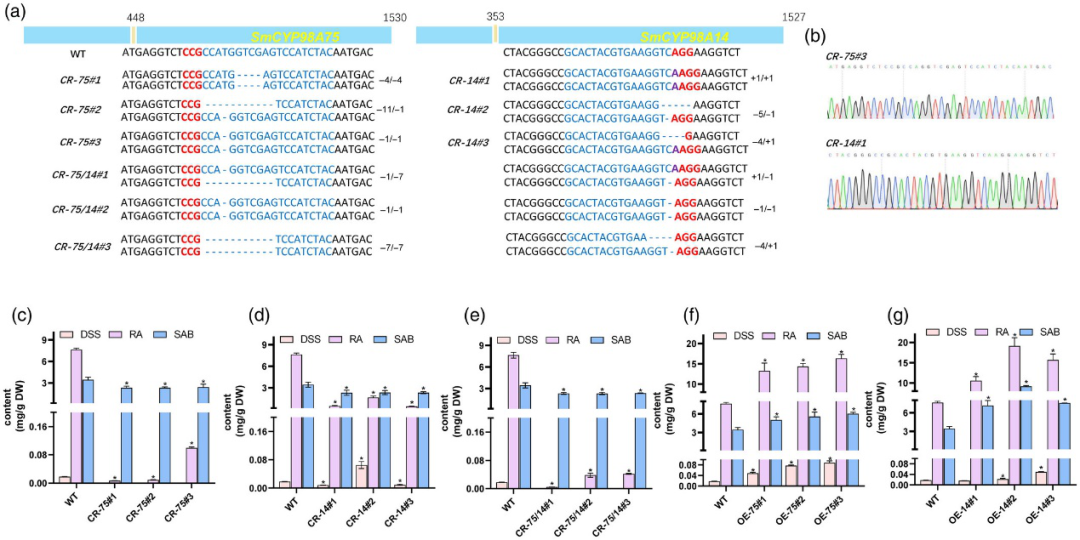 為了進(jìn)一步研究SmCYP98A75和SmCYP98A14在SA生物合成中的作用,作者利用CRISPR/Cas9技術(shù)生成了SmCYP98A75和SmCYP98A14單突變體和雙突變體。純合突變體用于分析SA積累(圖4a,b)。與WT相比,突變體顯示出更低的SA積累。SmCYP98A75 和SmCYP98A14 突變體的DSS、RA和SAB水平降低,尤其是SmCYP98A75突變體中幾乎檢測不到DSS。與WT相比,雙突變體中DSS和RA幾乎檢測不到,表明CYP98A成員在SA生物合成中都起著重要作用(圖4c-e)。進(jìn)一步檢測SA生物合成途徑中關(guān)鍵酶的表達(dá)水平,包括SmPAL、SmC4H、Sm4CL、SmTAT、SmHPPR和SmRAS在突變體毛根中的表達(dá)。結(jié)果表明,與WT相比,SmCYP98A75 和SmCYP98A14單突變系和雙突變系中SmPAL、SmC4H、SmTAT和SmRAS 的轉(zhuǎn)錄水平顯著降低。