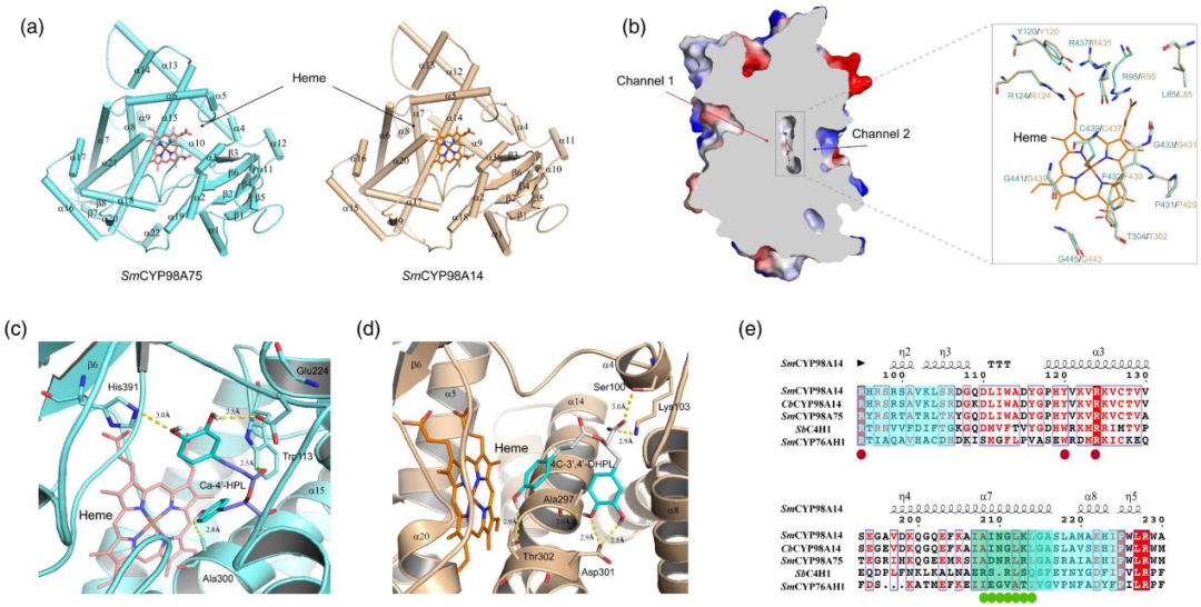 SmCYP98A75和SmCYP9814底物特異性的差異為研究底物識別和代謝的結(jié)構(gòu)特征提供了機(jī)會。使用在線SWISS-MODEL進(jìn)行同源建模。SmCYP98A75和SmCYP98A14的整體結(jié)構(gòu)模型高度相似,表明兩種SmCYP98A的底物識別和代謝是保守的。SmCYP98A75的整體結(jié)構(gòu)模型包含22個α螺旋和8個β鏈,SmCYP98A14的整體結(jié)構(gòu)模型包含20個α螺旋和6個β鏈,與 SmCYP98A14 高度相似(圖5a)。在結(jié)構(gòu)模型中觀察到血紅素分子與兩個 SmCYP98A 的活性結(jié)合口袋。通過與口袋內(nèi)殘基的多次相互作用,它被穩(wěn)定在正確的位置。兩種SmCYP98A和CbCYP98A14的血紅素包圍基序和關(guān)鍵催化氨基酸是高度保守的(圖5b)。基于與已知 P450 的疊加,通道 1 可能容納底物進(jìn)入和產(chǎn)物,而通道 2 可能使血紅素能夠進(jìn)入水和質(zhì)子。