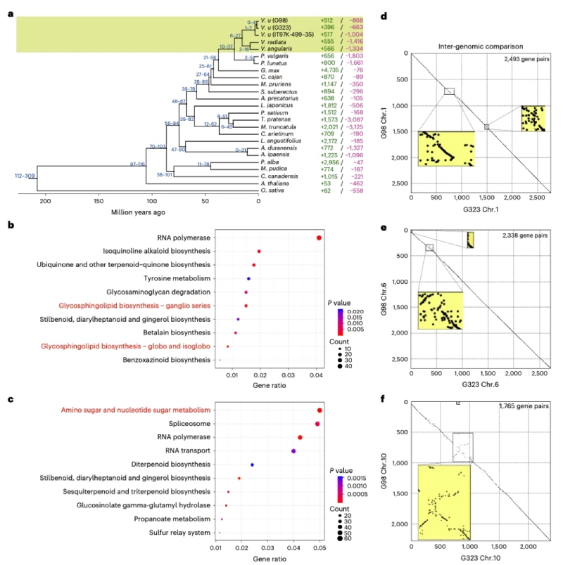 對25個物種進行系統(tǒng)進化樹分析顯示豇豆與赤小豆(V. angularis)和綠豆(V. radiata)親緣關(guān)系較近,它們的分化時間大約在6-27百萬年前(圖2a),這與之前的報道一致?;蚣易宸治霭l(fā)現(xiàn)G98中有512個家族發(fā)生了顯著擴張,這些擴張的基因家族在參與膜組織的鞘糖脂代謝途徑顯著富集,可能與菜用豇豆的豆莢發(fā)育相關(guān)。相反,G323擴張基因在氨基酸糖和核苷酸糖代謝、硫代葡萄糖苷-谷氨酰水解酶和半乳糖代謝等能量產(chǎn)生和轉(zhuǎn)化途徑中顯著富集(圖2b, c),這可能與糧用豇豆更高的碳水化合物積累和防御反應(yīng)有關(guān)。