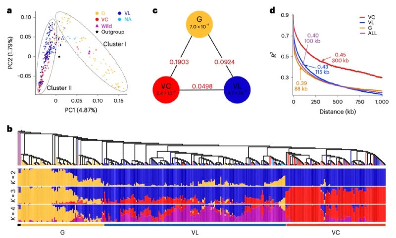 對三個亞群的核苷酸多樣性(π)和群體差異(Fst)進行分析(圖3c)。G組(π = 0.0007)核苷酸多樣性顯著高于VL組(π = 0.00047)和VC組(π = 0.00024)。G-VC(0.1903)和G- VL(0.0924)的FST值均高于VC-VL(0.0498)。此外,與VL和VC組相比,該組的連鎖不平衡衰減更快,表明糧用豇豆的遺傳重組程度更高(圖3d)。