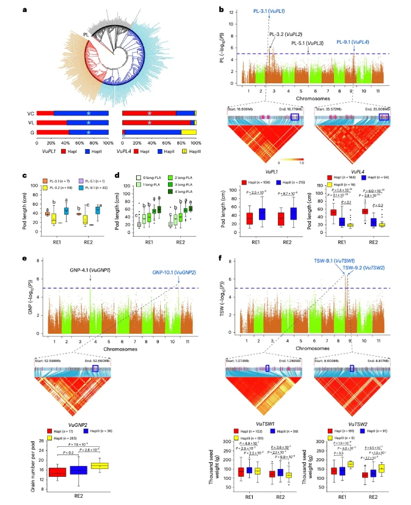 產(chǎn)量相關(guān)基因和品質(zhì)相關(guān)基因在3個亞群體(G、VL和VC)中的多態(tài)性和分布揭示了豇豆表型分化的遺傳基礎(chǔ)。莢長(PL)、單莢粒數(shù)(GNP)和千粒重(TSW)是影響豇豆產(chǎn)量的重要因素,G亞群的PL通常比VL和VC亞群的PL短得多(圖5a)。GWAS分析挖掘到與這3個性狀相關(guān)的位點和候選基因,并對候選基因單倍型及其表達分析,發(fā)現(xiàn)PL差異可能是由于VuPL1-HapII 和 VuPL4-HapI (圖5b) 在豇豆馴化和改良過程中強烈選擇引起的。在重組自交系(RIL)群體中進一步驗證了VuPL1和VuPL4的功能,發(fā)現(xiàn)VuPL1似乎比VuPL4在該群體中具有更強的作用。同時基因表達分析發(fā)現(xiàn)WAKs基因可能以劑量/轉(zhuǎn)錄依賴的方式導(dǎo)致PL差異。糧用豇豆的GNP也通常比菜用豇豆的低,可能是VuGNP2-HapIII這一有利單倍型引起的(圖5e)。TSW則可能與VuTSW1和VuTSW2基因的有利單倍型有關(guān)(圖5f),其功能也分別在RIL群體和F2群體中得到進一步驗證。