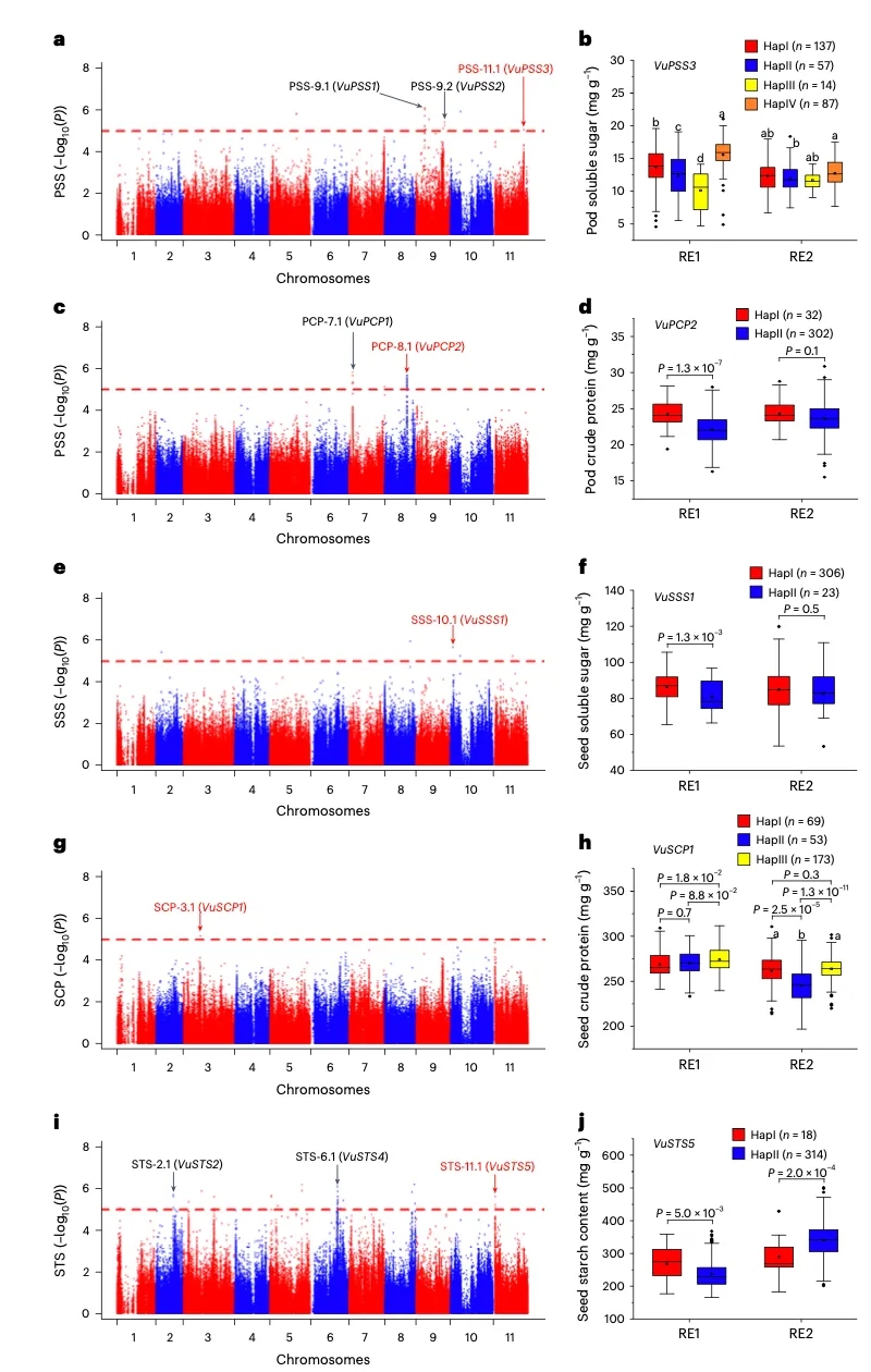 可溶性糖、總淀粉和粗蛋白質(zhì)含量是豆科作物的三個基本品質(zhì)性狀。GWAS分析檢測到三個信號與嫩莢可溶性糖含量(PSS)顯著相關(guān)(圖6a),其中VuPSS1可能是功能相關(guān)基因,VuPSS2可能通過其順式調(diào)控元件影響PSS含量,VuPSS3-HapIV單倍型是PSS的有利單倍型。嫩莢粗蛋白含量(PCP)差異可能與有利單倍型VuPCP1-HapII和VuPCP2-HapI有關(guān)。籽??扇苄蕴牵⊿SS)含量相關(guān)的信號(圖6e)包含一個FAR1-related SEQUENCE (FAR1)家族蛋白(VuSSS1),F(xiàn)AR1在淀粉合成以及糖的運輸和降解中起作用,VuSSS1-HapI為其有利單倍型(圖6f)。VuSCP2-HapIII和VuSCP2-HapIV通常導(dǎo)致更高的籽粒粗蛋白含量(SCP),VuSCP1和VuSCP2相似的表達模式提示它們可能影響種子發(fā)育中期的SCP表型。籽??偟矸酆浚⊿TS)GWAS分析檢測到5個相關(guān)信號(圖6i),STS-2.1中的VuSTS2含有一個MYB轉(zhuǎn)錄因子,STS-11.1中的VuSTS5編碼一個磷脂酰絲氨酸脫羧酶,該酶可能影響植物發(fā)育的關(guān)鍵調(diào)節(jié)因子磷脂酰絲氨酸。兩種基因的不同單倍型在兩種環(huán)境中表現(xiàn)出不同的STSs,這表明它們在很大程度上受環(huán)境條件的影響(圖6j)。STS-3.1中的VuSTS3編碼了一個未知的蛋白,其中VuSTS3-HapIII對STS的影響最大。STS-6.1含有一個NAD依賴性蛋白去乙?;竀uSTS4,可能影響淀粉的生物合成和調(diào)控,而VuSTS4-HapI對STS的作用更強。以上結(jié)果有潛力成為糧用豇豆和菜用豇豆產(chǎn)量和品質(zhì)改善的遺傳資源。