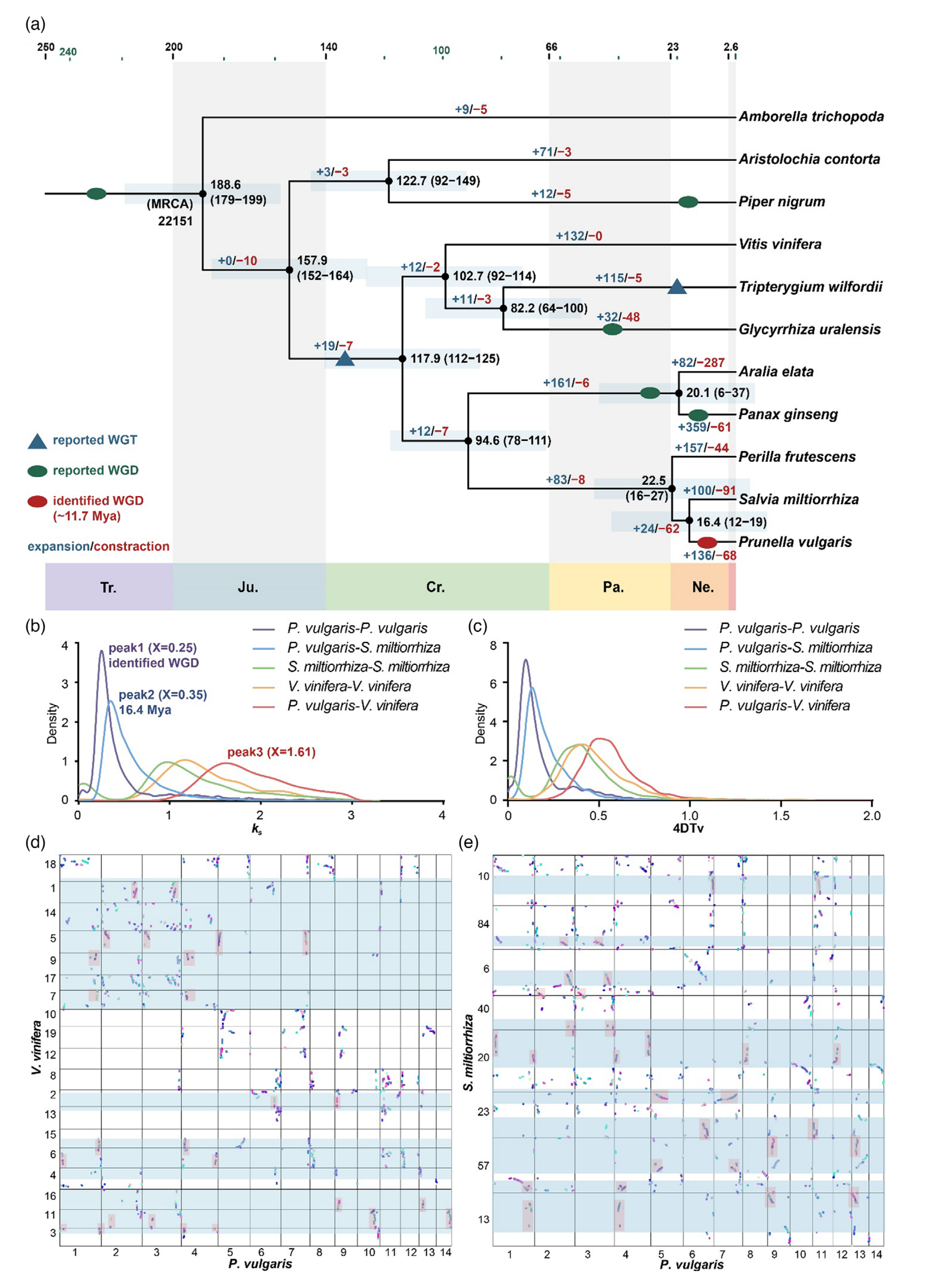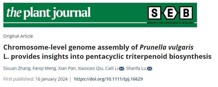 2024年1月16日,The Plant?Journal上線了一篇關(guān)于夏枯草基因組的研究論文,“Chromosome-level genome assembly of?Prunella vulgaris?L. provides insights into pentacyclic triterpenoid biosynthesis”,報道了組裝到染色體水平的夏枯草基因組,為進一步闡明五環(huán)三萜的生物合成機制奠定了基礎(chǔ)。