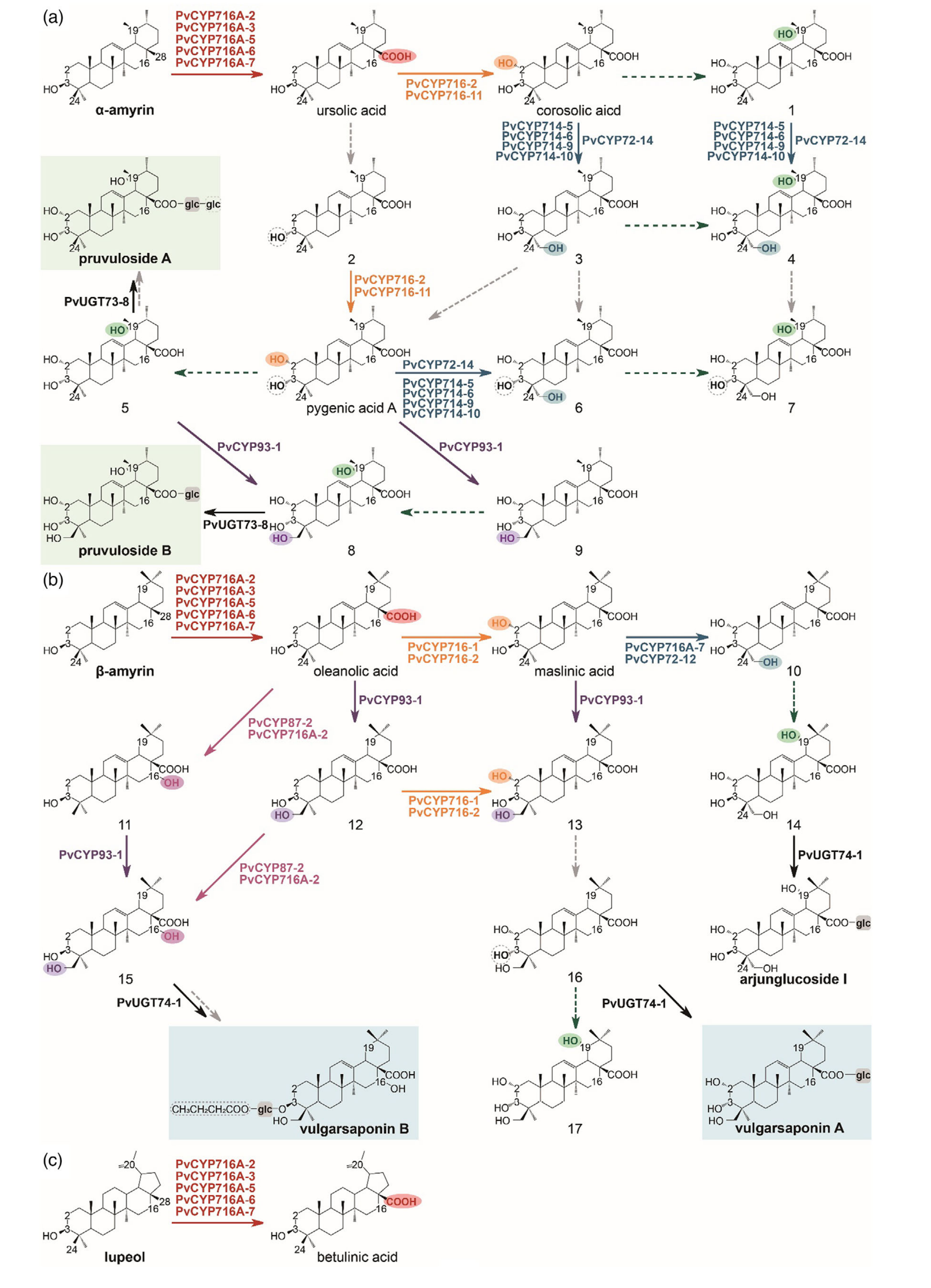 CYP超家族是植物中最大的基因超家族之一。根據(jù)CYP系統(tǒng)發(fā)育樹的分支,植物CYP蛋白可分為11個氏族和127個家族。有七個氏族是單家族,包括CYP51、CYP74、CYP97、CYP710、CYP711、CYP727、CYP746,而其余的CYP71、CYP72、CYP85、CYP86氏族為多家族。在生成骨架后,在五環(huán)三萜的C-2、C-3、C-16、C-19、C-22、C-23、C-24、C-28等不同位點進行氧化和糖基化修飾,生成大量的三萜。氧化修飾主要涉及CYP716家族成員。此外,CYP51、CYP71、CYP72、CYP85、CYP87、CYP88和CYP93家族的一些成員也可能參與。
