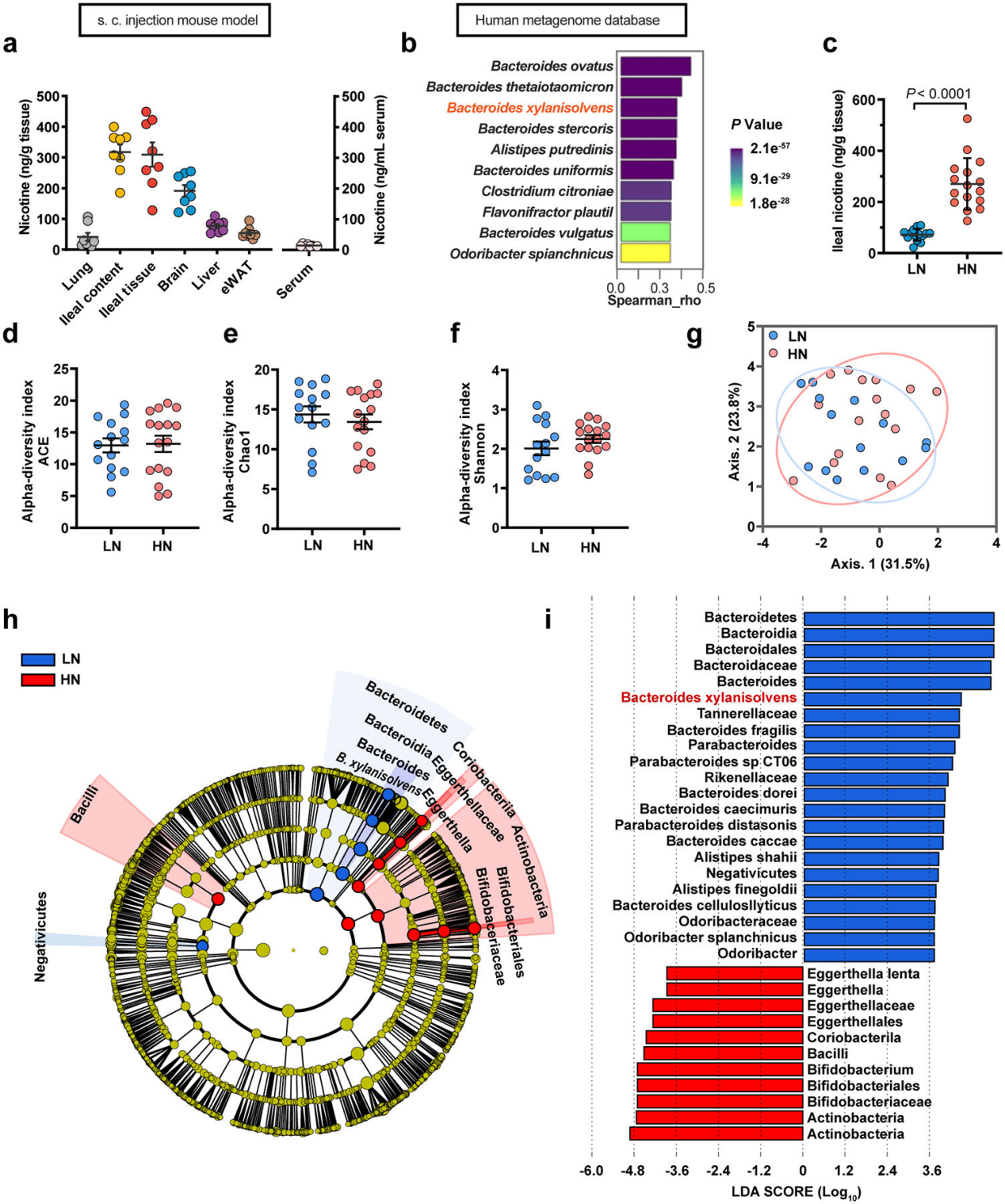 在吸煙者的回腸粘膜組織中檢測(cè)到高水平的尼古丁,表明在吸煙期間尼古丁會(huì)在腸道中積聚(圖1a)。內(nèi)源性腸道細(xì)菌有助于尼古丁的降解(圖1C)。從公共宏基因組數(shù)據(jù)庫(kù)中篩選攜帶已知尼古丁分解代謝基因的潛在菌株。在幾個(gè)菌株中發(fā)現(xiàn)了nicA基因(一種已知的尼古丁降解酶)的同源序列,表明這些菌株具有降解尼古丁的潛力。宏基因組學(xué)分析發(fā)現(xiàn)B.xylansolvens可能含有尼古丁分解代謝基因,并被鑒定為與LN和HN組之間的分離相關(guān)的主要驅(qū)動(dòng)因素(圖1D),B.xylansolvens在nicX存在的情況下具有降解尼古丁的能力。