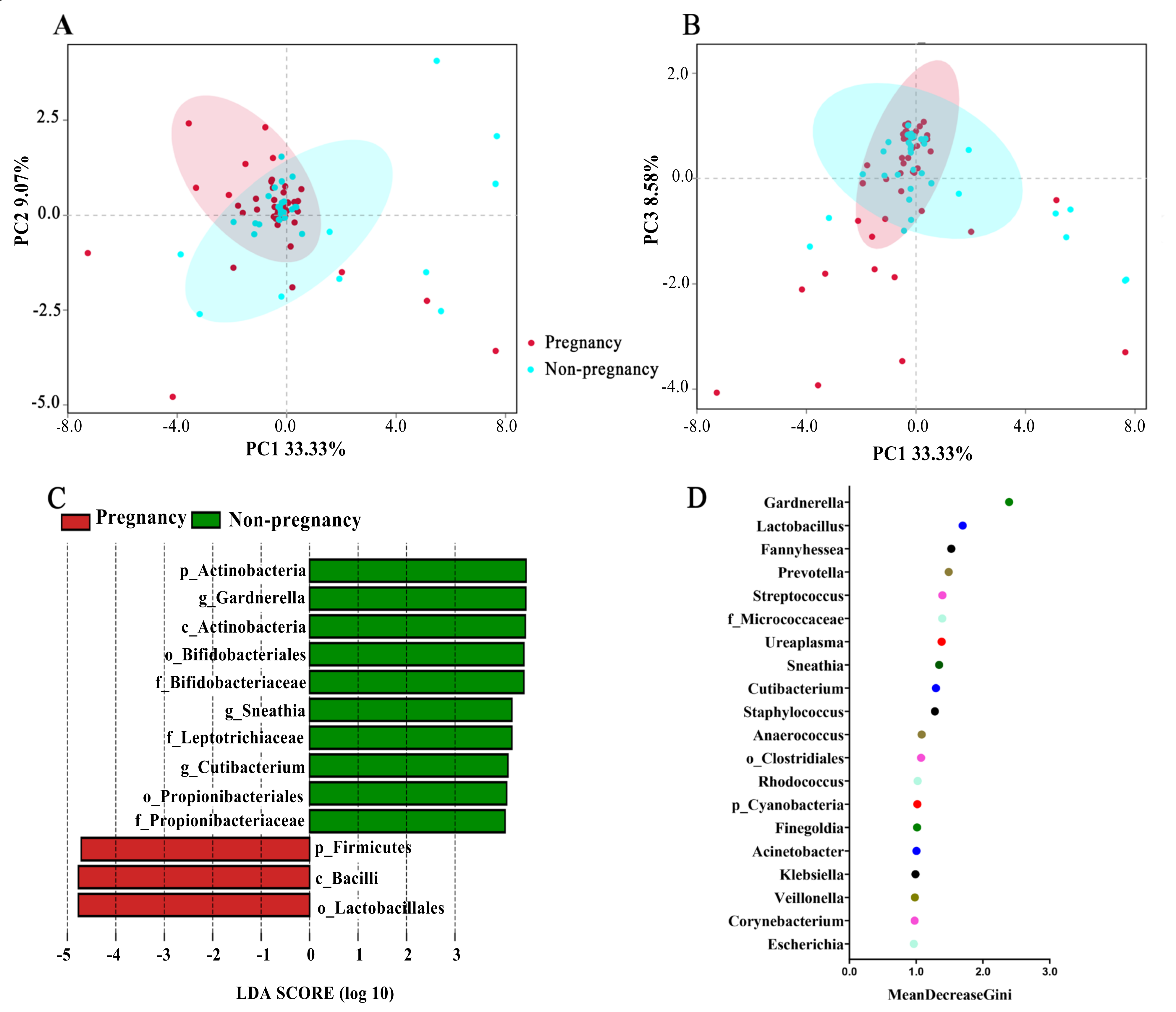 對(duì)陰道拭子進(jìn)行微生物多樣性測(cè)序分析。結(jié)果表明,在屬水平上,豐度最高的最常見細(xì)菌是Lactobacilli、Gardnerella(8.57%)、Streptococcus?(1.79%)和Atopobium(1.54%)。PCoA顯示這兩組的陰道微生物群落結(jié)構(gòu)略有不同;Lefse分析表明,妊娠組乳乳酸桿菌(Lactobacillus)豐度高于非妊娠組。非妊娠組中放線菌門和加德納菌屬的豐度高于妊娠組。在屬水平上,潛在生物標(biāo)志物包括?Gardnerella、Lactobacil-lus和Fannyhessea,(圖2D)。妊娠組加德納菌的相對(duì)豐度顯著低于未妊娠組。
