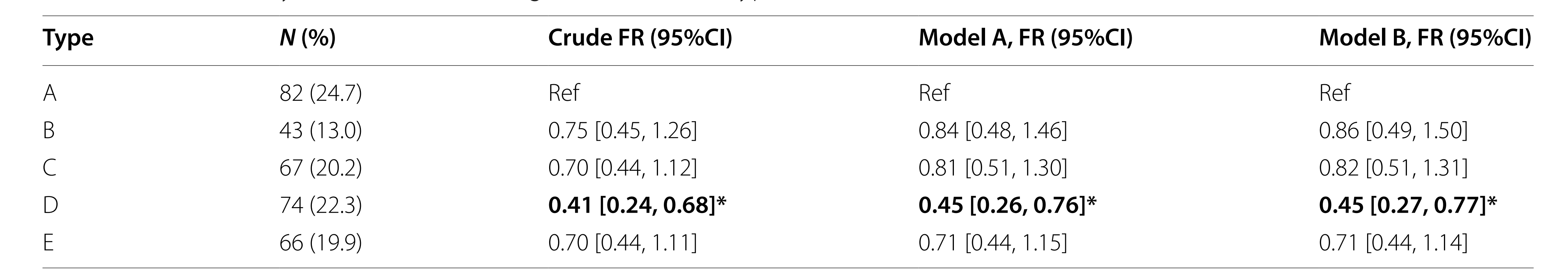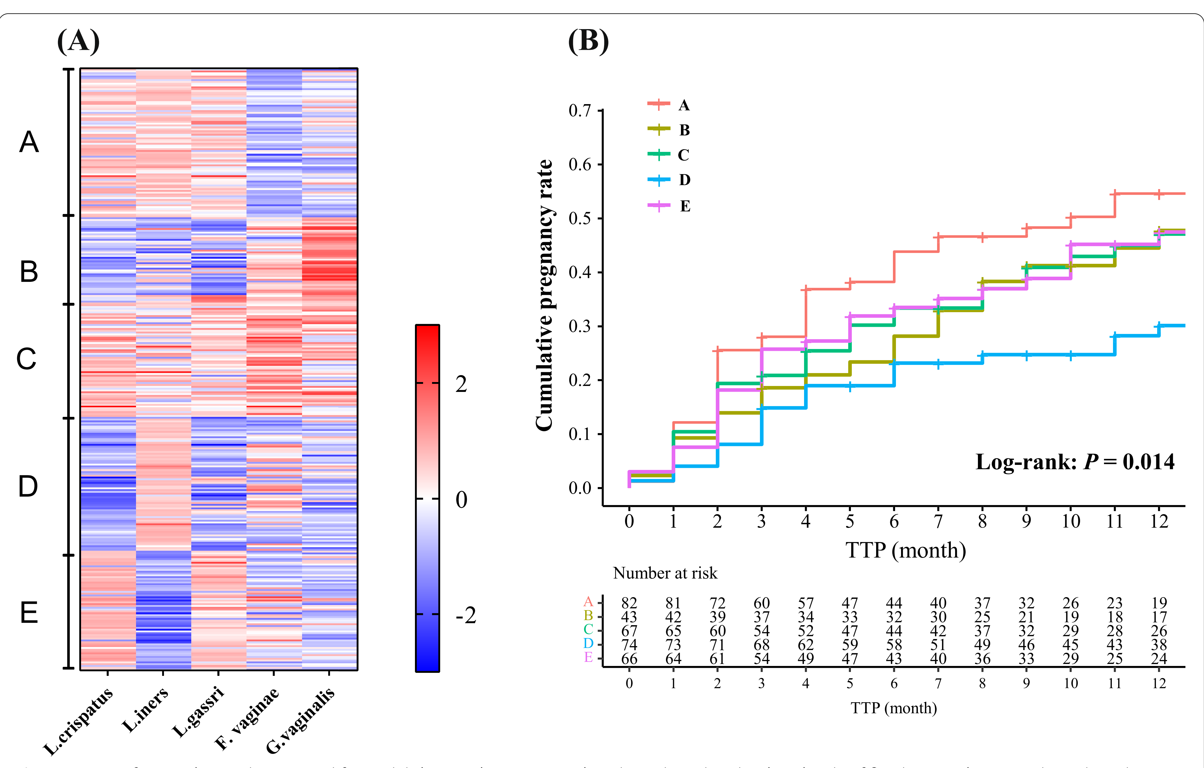 根據(jù)五種細(xì)菌的絕對(duì)負(fù)荷量,發(fā)現(xiàn)陰道微生物群聚為五種類型(A-E)。圖4A顯示A型(24.7%,82/332)以三種高豐度乳桿菌和低豐度的G.vaginalis和F.vaginae為特征。B型(13.0%,43/332)表現(xiàn)為G.vaginalis高豐度,三種乳桿菌豐度低。C型(20.2%,67/332)以高豐度F.vaginae為主和適度豐富的三種乳桿菌。D型(22.3%,74/332)的特征是Liners豐度較高,其余4種豐度較低。E型(19.9%,66/332)表現(xiàn)為L(zhǎng). crispatus和L.gasseri豐度較高,其他三種豐度較低。圖4B顯示,具有不同類型陰道微生物群的婦女具有不同的生育能力。A型陰道微生物組的累積妊娠率最高,而D型陰道微生物組的累積妊娠率最低。B型、C型和E型的累積妊娠率相似。