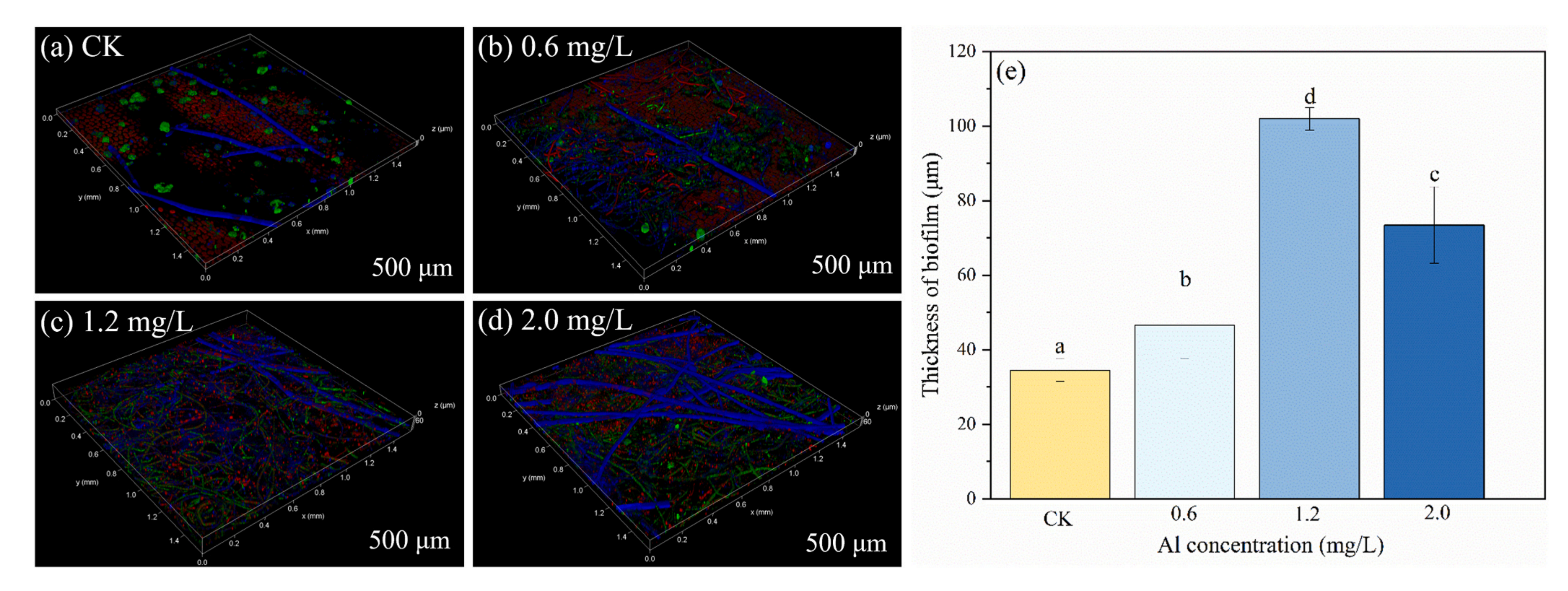 隨著Al濃度的升高,葉片上的生物膜聚集情況逐漸增加。利用多重?zé)晒馊旧虲LSM,我們觀察了Al處理下生物膜組分的不同性質(zhì),注意到核酸濃度在1.2 mg/L組達(dá)到峰值(圖1c)。藻類密度和附著生物膜厚度隨Al濃度的增加而增加,1.2 mg/L組最大厚度為101.94μm,CK組為34.50μm(圖1e)。結(jié)果表明,鋁處理促進(jìn)了苦草附著生物膜的生長(zhǎng)。所觀察到的現(xiàn)象可能歸因于Al離子分散到水生環(huán)境中,隨后與水體中的氮和磷形成聚集體。這些聚集體通過(guò)沉降作用積聚在沉水植物葉片表面,增加附著生物膜內(nèi)的氮和磷含量,促進(jìn)附著微生物的生長(zhǎng)。