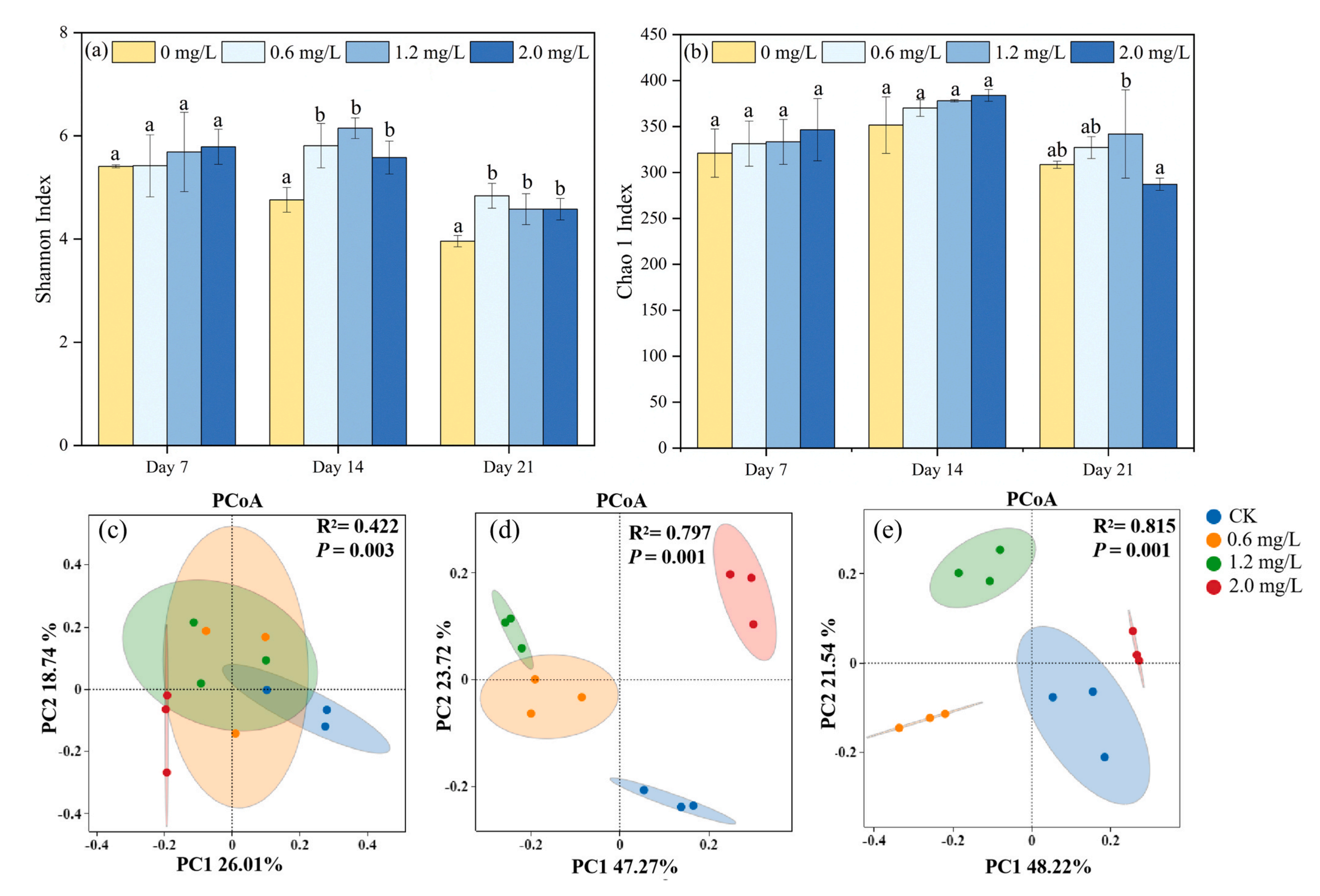 第14天,CK和0.6 mg/L組的Shannon多樣性均高于1.2和2.0 mg/L組(圖2a),處理間Chao1指數(shù)無(wú)顯著變化(圖2b, P>0.05);