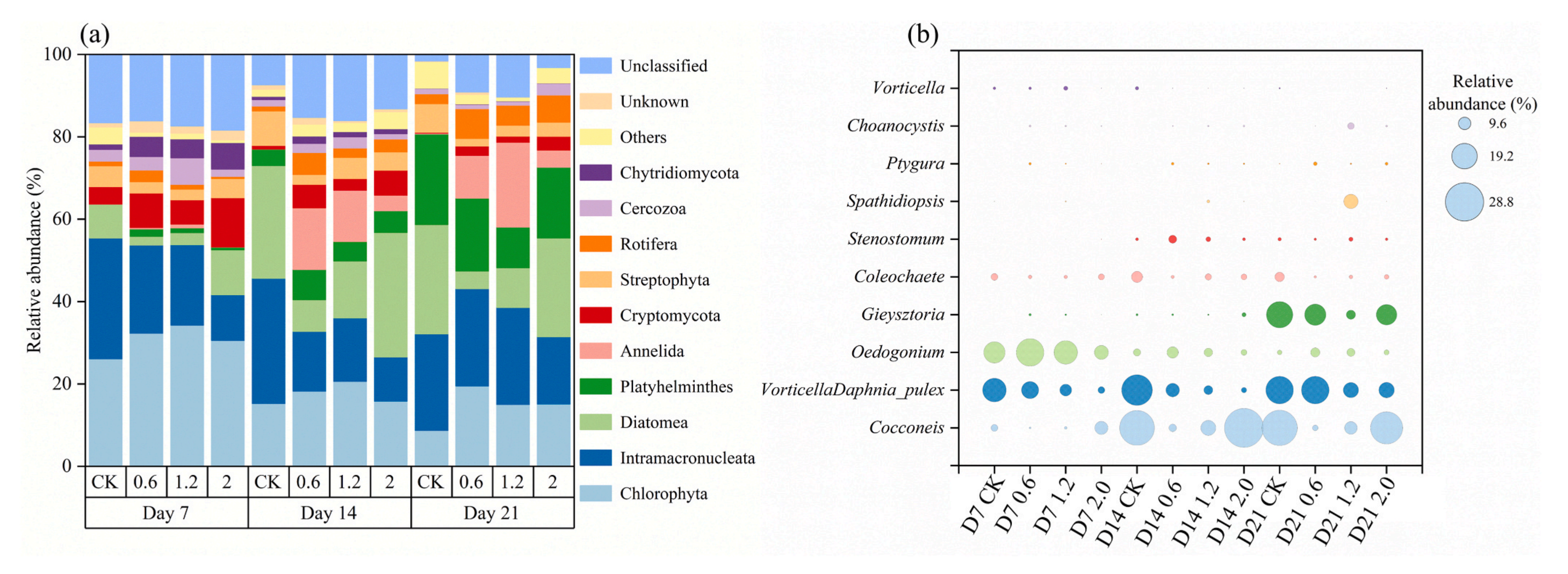 根據(jù)注釋結(jié)果,在所有樣本中鑒定出10個(gè)優(yōu)勢(shì)的微型真核生物門,分別是Chlorophyta(8.71–34.25%),Intramacronucleata (10.69–30.43%),Diatomea (2.11–30.24%), Platyhelminthes (0.02–22.00%),Annelida (0.04–20.60%), Cryptomycota (0.21–11.99%), Streptophyta (1.84–8.37%),Rotifera (0.52–7.23%),Cercozoa (0.91–6.45%),Chytridiomycota (0.07–6.42%) (圖5a)。值得注意的是,在處理組中Rotifers的豐度顯著增加(圖5a)。在實(shí)驗(yàn)后期,尤其是處理組,Platyhelminthes 和 Annelida的相對(duì)豐度有所增加(圖5a)。