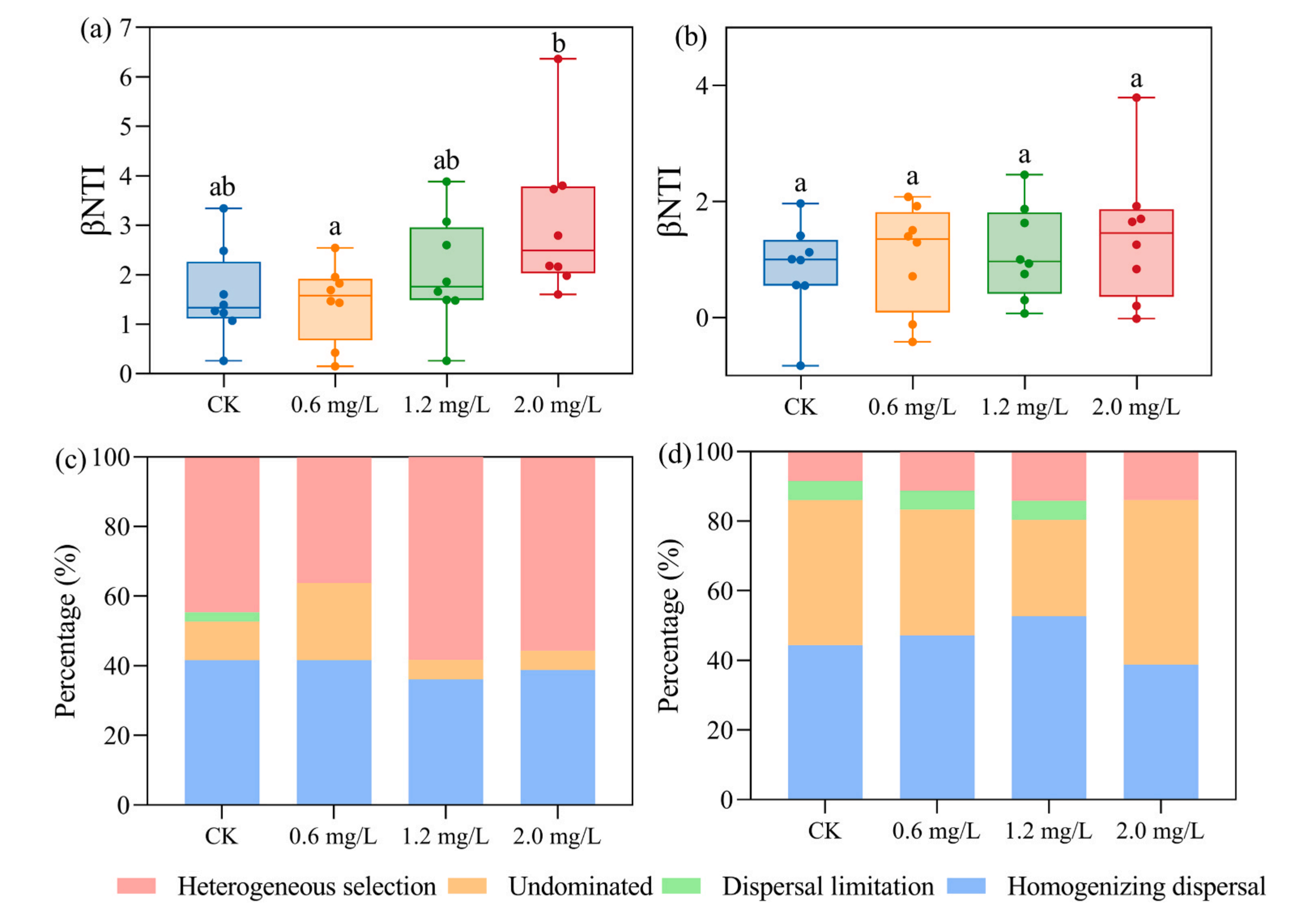 圖6-不同處理組中細(xì)菌(a)和微型真核生物(b)的βNTI分布。細(xì)菌(c)和微型真核生物(d)群落組裝的周轉(zhuǎn)百分比主要由不同的隨機(jī)過(guò)程(dispersal limitation and homogenizing dispersal)和確定性過(guò)程(homogeneous selection)決定,以及處理中不受任何單一過(guò)程(Undominated)控制的百分比。