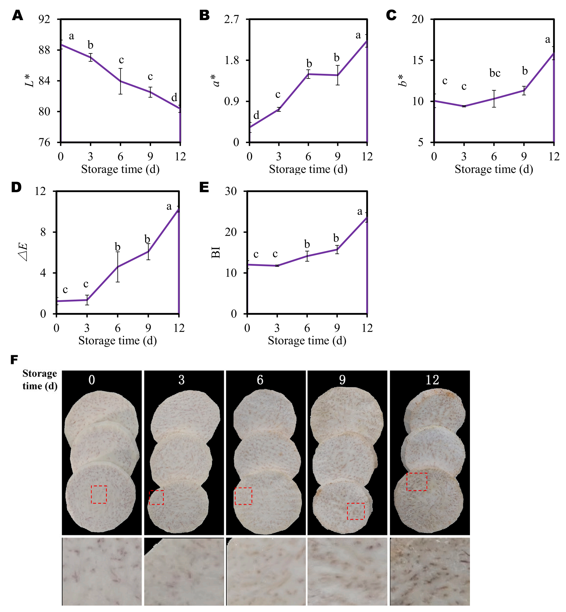 芋片切面顏色隨貯藏時間的變化如圖1A所示。切面L*值從0 d時的88.72下降到12 d時的80.36,冷藏12 d后L*值下降了9%(圖1A)。芋頭切片表面的a*、b*、△E和BI值在冷藏過程中也表現(xiàn)出類似的變化趨勢(圖1B-E)。這些褐變指標隨著貯藏時間的延長而增加。冷藏12 d后,a*、b*、△E和BI值分別比0 d增加了582%、58%、725%和19%(圖1B-E)。宏觀褐變癥狀在第6天首次出現(xiàn),并在隨后的儲存過程中逐漸加劇(圖1F)。綜上所述,這些結果表明,即使在低溫(4℃)條件下,切片芋頭在儲存過程中也會發(fā)生褐變。