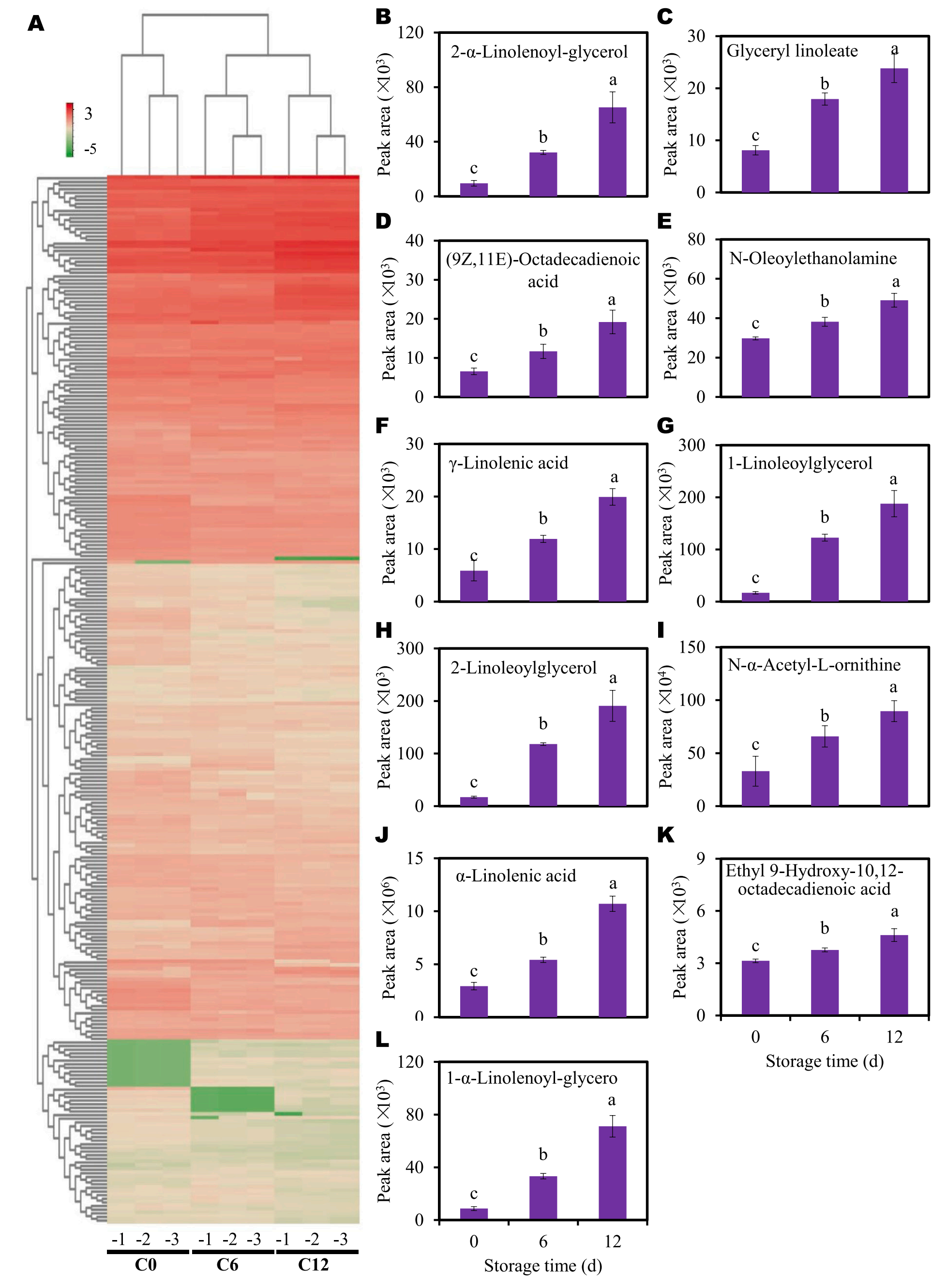 為進一步分析代謝物在9個樣本的積累模式,該研究進行了聚類熱圖分析。結果顯示,隨著貯藏時間的延長,褐變程度逐漸增加,推測持續(xù)增加的DAMs可能有助于切片芋頭的褐變或促進其褐變過程。因此,該研究關注分析在褐變過程中豐度持續(xù)上升的DAMs (圖3B-L)。確定了11個DAMs在褐變過程中豐度持續(xù)增加,如2-α-亞麻烯酰甘油、甘油亞油酸、(9Z,11E)-十八烯二烯酸、N-油基乙醇胺、γ-亞麻酸、1-亞麻油基甘油、2-亞麻油基甘油、N-α-乙?;? L-鳥氨酸、α-亞麻酸、9-羥基-10、12-十八烯二烯酸和1-α-亞麻烯酰甘油。值得注意的是,在這11個DAMs中,有10個是脂肪酸或脂質衍生物。幾種褐變指標與這些水DAMs之間的相關系數(shù)非常高。這些結果表明,在切片芋頭中脂質代謝與褐變發(fā)展之間存在潛在的聯(lián)系。