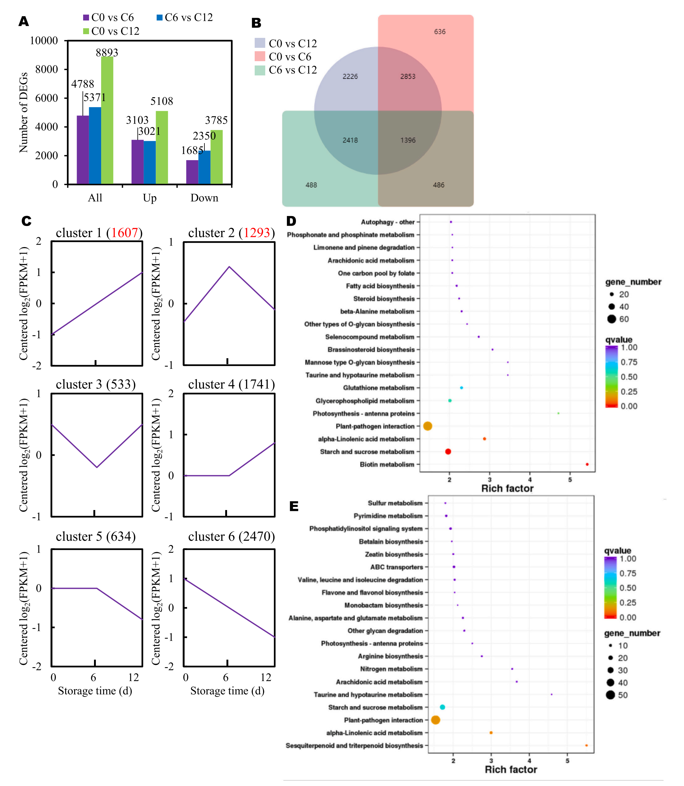 為了更好地了解基因表達的變化,該研究進行比較轉錄組分析。結果顯示許多基因在芋褐變過程中表現(xiàn)出不同的表達譜。具體來說,在C0和C6的比較中,鑒定出3103個表達上調的基因和1685個表達下調的基因。同樣,在C6和C12組的比較中,發(fā)現(xiàn)3021個DEGs上調,2350個DEGs下調。此外,與C0組相比,C12組有5108個基因的表達量更高(圖4A)。在褐變過程中發(fā)現(xiàn)了更多的上調基因,表明芋頭的基因表達發(fā)生顯著的變化。有趣的是,當比較C0與C6、C6與C12、C0與C12之間的DEGs時,發(fā)現(xiàn)1396個DEGs重疊(圖4B)。