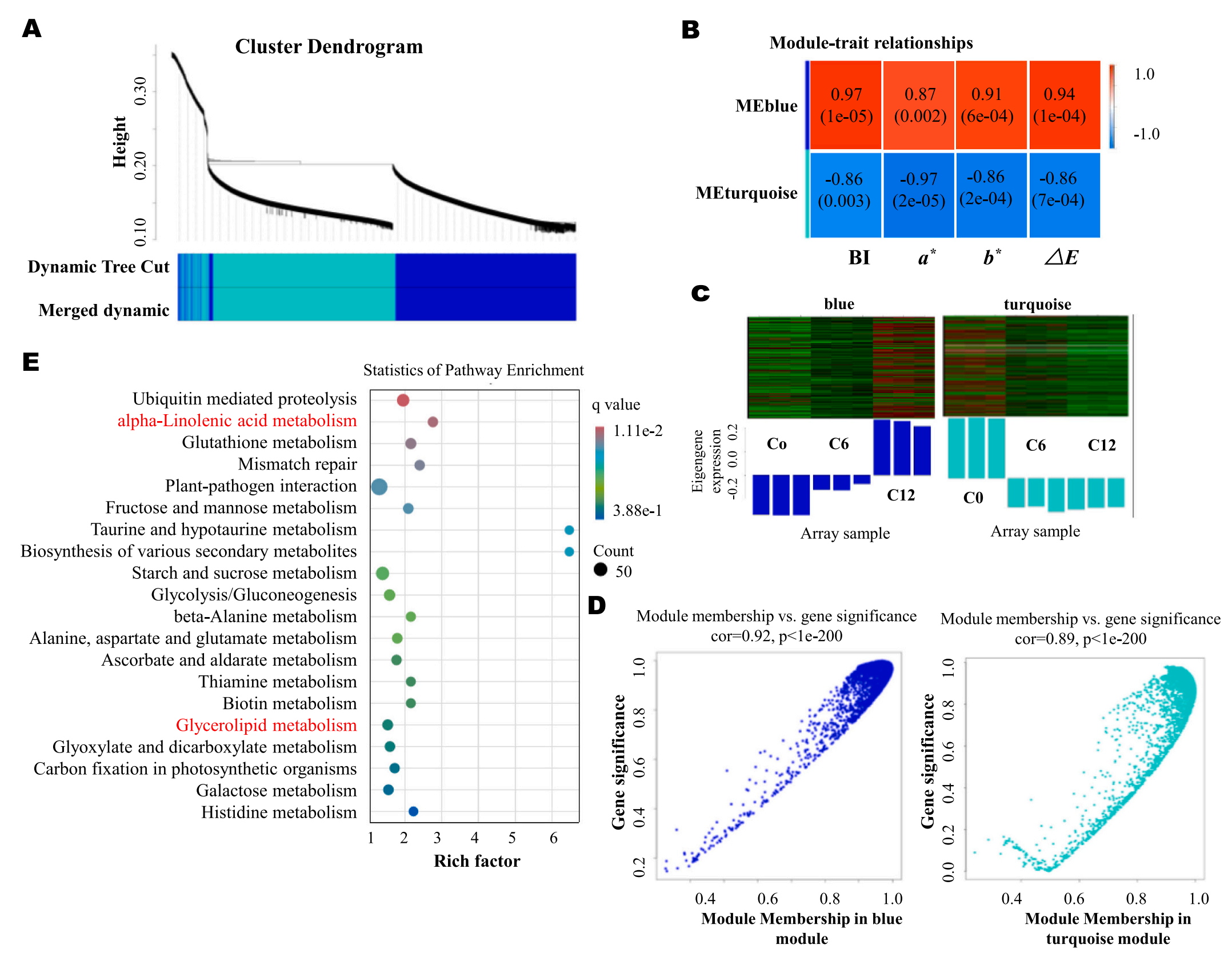 為了進一步研究脂質代謝與冷藏芋頭切片褐變之間的關系,研究采用WGCNA分析進行研究。如圖5A所示,鑒定出兩個與切片芋頭在冷藏期間褐變發(fā)育顯著相關的模塊。藍色模塊中基因與褐變BI、a*、b*、△E 4項指標呈正相關,而綠松石模塊中基因與褐變指標呈負相關(圖5B)。此外,隨著褐變的發(fā)展,藍色模塊中基因的表達量逐漸增加,而綠松石模塊中基因的表達量逐漸減少(圖5C)。此外,藍色和綠松石模塊中每個基因與褐變的相關性都很高(圖5D),說明這兩個模塊的基因與冷藏芋頭片的褐變發(fā)育高度相關。