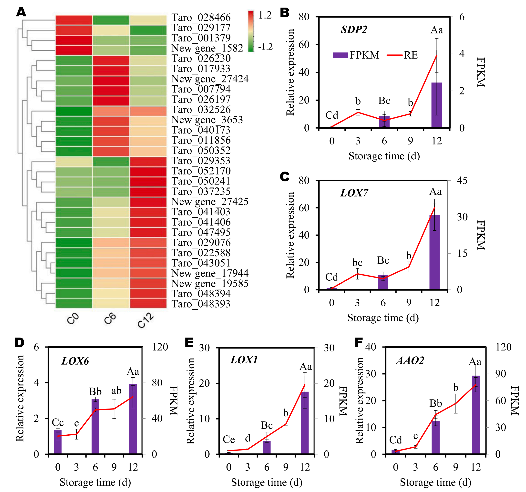 為了驗證RNA-seq數(shù)據(jù)的質量,研究檢測了亞麻酸代謝途徑中DEGs的表達模式。在切片芋頭褐變過程中,該途徑中的DEGs差異表達(圖6A)。在這些基因中,4個基因(taro_028466、029177、001379和new gene_1582)的表達量在第6天較0天下降(圖6A)。10個基因(taro_026230、017933、007794、026197、032526、040173、011856、050352以及new gene_27424和3563)的表達量在第6天出現(xiàn)了增加,隨后又出現(xiàn)了下降。然而,這些基因在第12天的表達水平仍然高于第0天(圖6A)。其余15個基因在褐變過程中表現(xiàn)出穩(wěn)定的表達增加。這些結果再次證實了亞麻酸代謝參與了芋頭褐變過程。