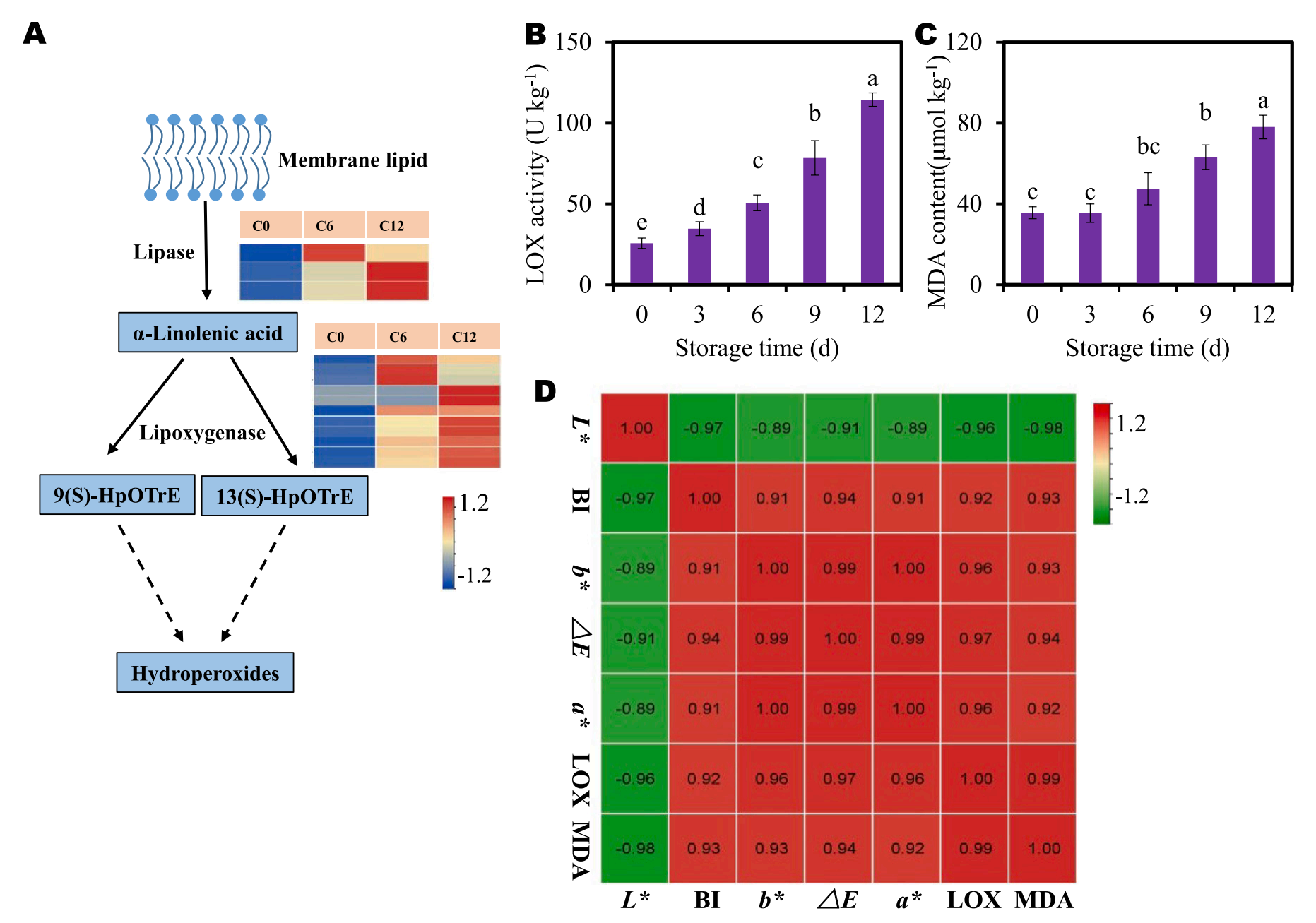 丙二醛通常被認為是植物脂質過氧化的生物標志物。為了監(jiān)測切片芋頭褐變過程中膜脂過氧化情況,測定了LOX活性和MDA含量。隨著時間的推移,LOX活性和MDA含量隨著褐變繼續(xù)進行逐漸升高 (圖7B, C)。這些結果表明,在褐變過程中,膜脂過氧化加劇。此外,相關分析顯示,LOX活性、MDA含量和其他褐變指標之間存在很強的相關性?(圖7D)。這些結果進一步支持了膜脂過氧化和/或代謝參與芋頭褐變。