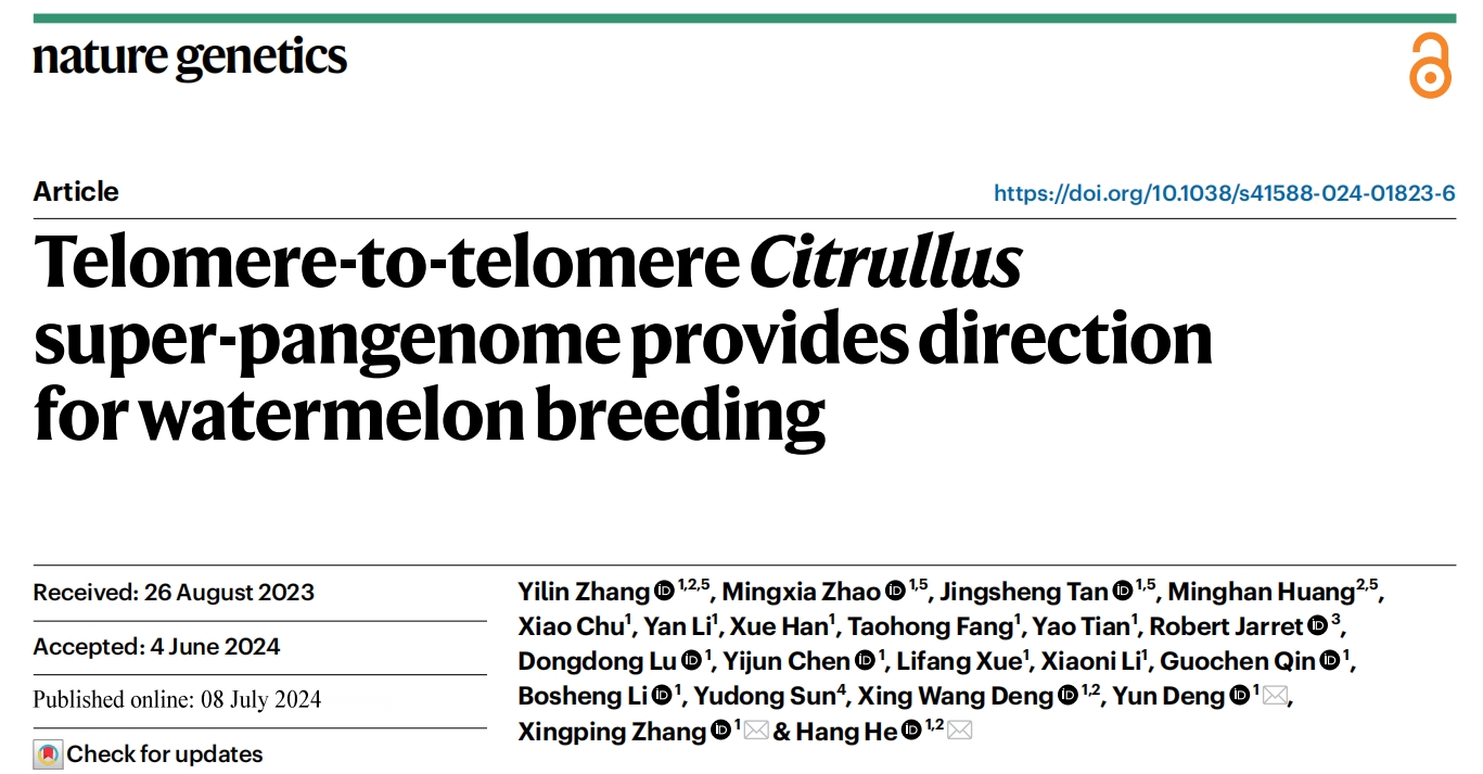 2024年7月8日,北京大學現(xiàn)代農(nóng)業(yè)研究院在國際頂尖期刊《自然-遺傳學》上在線發(fā)表了題為Telomere-to-telomere?Citrullus?Super-pangenome Provides Direction for Watermelon Breeding的研究成果,是西瓜科研領域的重大突破。