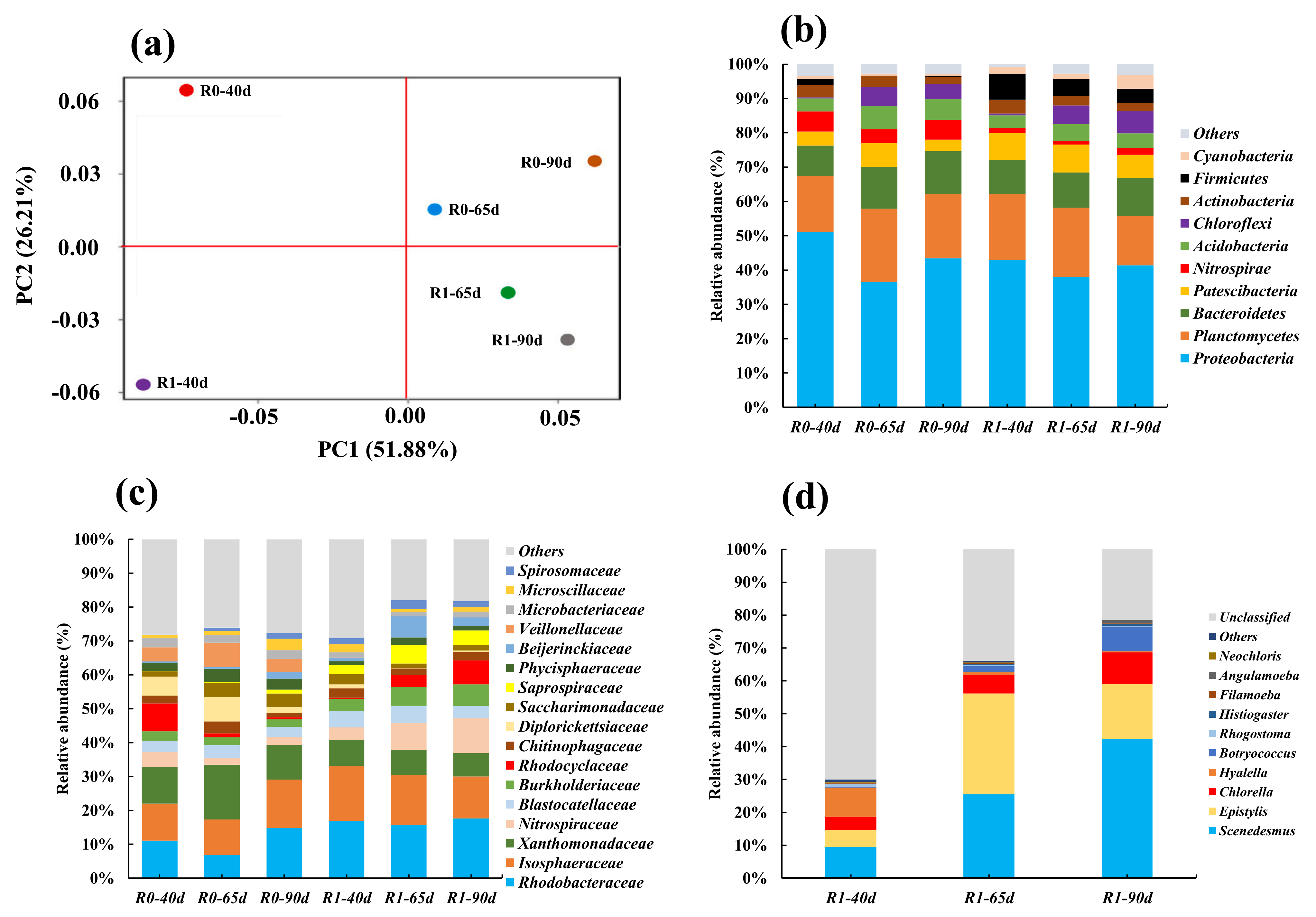 PCoA分析結(jié)果顯示,r0和r1之間在40天時(shí)差異最大,說明微藻的生長導(dǎo)致了BGS和ABGS之間的細(xì)菌進(jìn)化的顯著差異。而在添加抗生素后,R0和R1在第65天和第90天的位置較初始有明顯偏移,表明抗生素的選擇壓力改變了BGS和ABGS的細(xì)菌群落結(jié)構(gòu)。門水平相對豐度結(jié)果顯示,變形菌門、浮霉菌門和擬桿菌門一直是R0和R1的三個(gè)優(yōu)勢門,表面其受抗生素影響較小。研究表明,變形菌門和擬桿菌門是好氧廢水處理系統(tǒng)中常見的兩種異養(yǎng)細(xì)菌,主要具有去除氮、磷和水解大分子有機(jī)物的功能,而變形菌門和浮霉菌門對抗生素具有高度的固有耐藥性,并且與大多數(shù)靶ARGs呈正相關(guān),硝化螺旋菌主要富集在r0中,而厚壁菌門主要富集在R1中。添加抗生素后,氯霉在R0和R1中的相對豐度上升,而氯霉可作為可移動(dòng)遺傳成分轉(zhuǎn)移的指示物種??扑降姆治鼋Y(jié)果表明,紅桿菌科、異孢菌科和黃單胞菌科是R0和R1的優(yōu)勢菌,表明他們對抗生素具有一定程度的耐藥性,并在維持顆粒狀穩(wěn)定性方面發(fā)揮了重要作用。此外,添加抗生素后,硝化螺菌科、紅環(huán)菌科在R0中豐度下降而在R1中上升,腐螺旋菌科也在R1中富集。據(jù)報(bào)道,硝化螺菌科、紅環(huán)菌科和腐螺旋菌科與廢水中營養(yǎng)物質(zhì)的去除密切相關(guān),微藻可能促進(jìn)其在ABGS中的生長,也表明ABGS中的微藻生長也有利于提高硝化螺旋體科、紅環(huán)科和腐螺旋體科的耐藥性。此外,韋榮氏球菌科主要富集在R0中,韋榮氏球菌科與污水處理廠大量ARGs和intI1呈顯著正相關(guān),這可能是造成R0中ABGS中ARGs水平低于BGS的部分原因。真核生物屬水平相對豐度分析結(jié)果顯示,ABGS中斜生四鏈藻和小球藻的持續(xù)生長提高了抗生素和常規(guī)污染的去除效率。