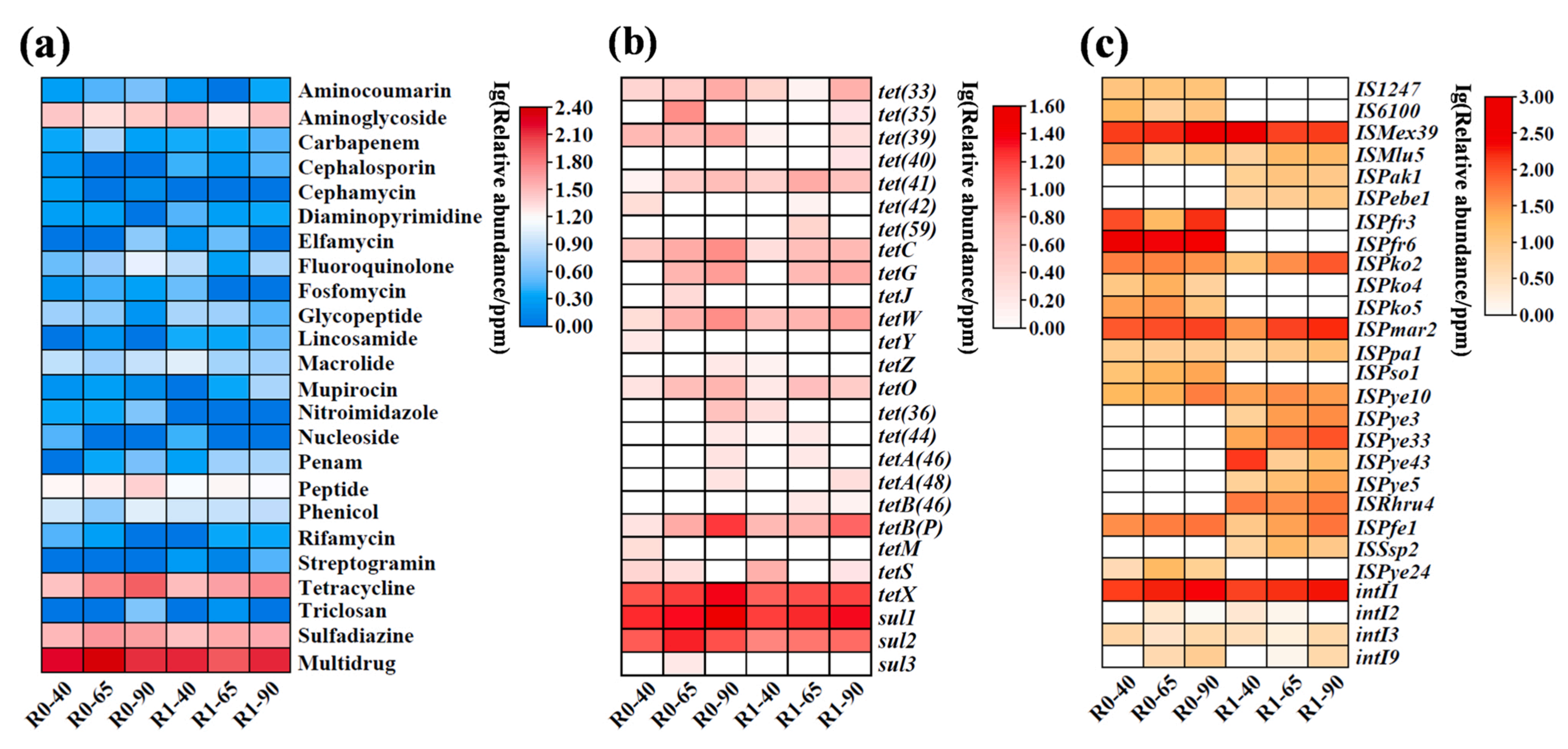 此外,一些非TC和SDZ相關(guān)的ARGs也被富集,是由于抗生素的共選擇效應(yīng),即一些微生物可以編碼存在于同一染色體、質(zhì)粒、轉(zhuǎn)座子或整合子中的多個(gè)ARGs,而氨基糖苷類和多肽的比例增加更明顯,可能是由于它們對TC和SDZ的選擇壓力更敏感。R0和R1中檢測到的TC/SDZ相關(guān)的ARGs亞型總數(shù)有26個(gè)((23tets?及 3?suls),其中17個(gè)tets和2個(gè)suls是共有的,R0和R1中tetX基因含量最高,而sul1在R0和R1中為優(yōu)勢基因,由于tetX基因參與了TC的生物降解和轉(zhuǎn)移,因此兩種反應(yīng)體系中TC的高去除效率可以歸因于該基因的顯著富集,sul1明顯的富集可能與intI1介導(dǎo)的水平基因轉(zhuǎn)移(HGT)過程有關(guān)。