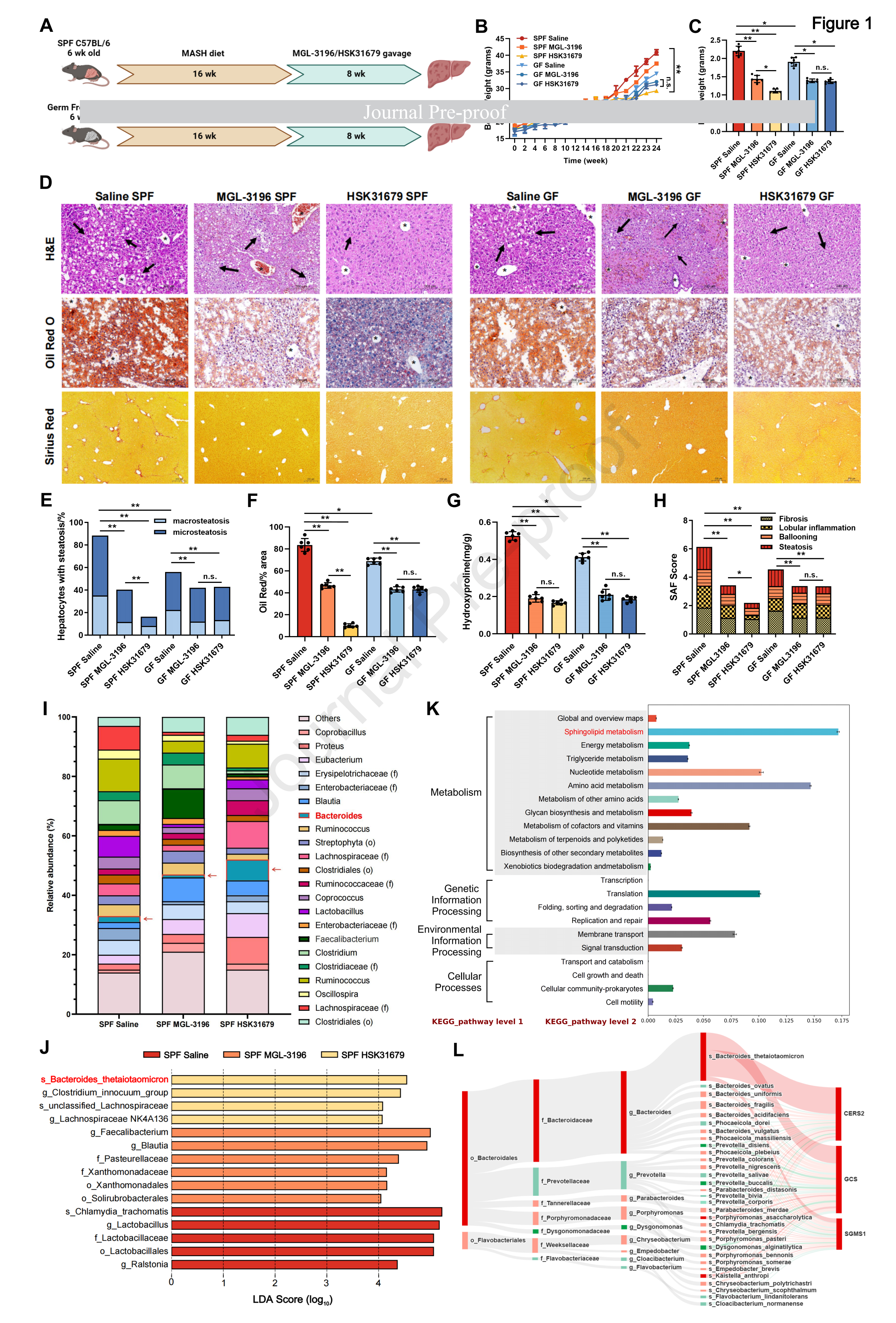 為了研究THR-β激動(dòng)劑治療 MASH對(duì)腸道微生物群的影響,研究者在沒有腸道微生物定群的情況下飼養(yǎng)的C57 BL/6 GF小鼠喂食高脂肪、果糖和膽固醇飲食(MASH飲食)和SPF對(duì)照組16周。然后每日給予MGL-3196或HSK 31679 3毫克/kg劑量,口服,持續(xù)8周(圖1A)。如圖1B所示,MGL-3196灌胃對(duì)SPF和GF小鼠的體重均沒有明顯影響,而HSK 31679導(dǎo)致SPF小鼠的體重增加具有統(tǒng)計(jì)學(xué)意義,但GF小鼠沒有。服用MASH飲食然后接受MGL- 243 3196/HSK 31679處理的SPF小鼠表現(xiàn)出肝臟重量明顯下降(p < 0.01;圖1C),HSK31679 組 SPF 小鼠的體重增加、肝臟重量、血清和肝臟甘油三酯和膽固醇水平、血清 ALT、AST 和 GGT 水平以及肝臟脂質(zhì)變性程度均顯著低于 MGL-3196 組。HSK31679 組 SPF 小鼠的肝臟炎癥和纖維化相關(guān)基因表達(dá)水平也顯著低于 MGL-3196 組。無(wú)菌小鼠模型中,MGL-3196 和 HSK31679 組的 MASH 病理表現(xiàn)相似,表明 HSK31679 的療效依賴于腸道菌群。