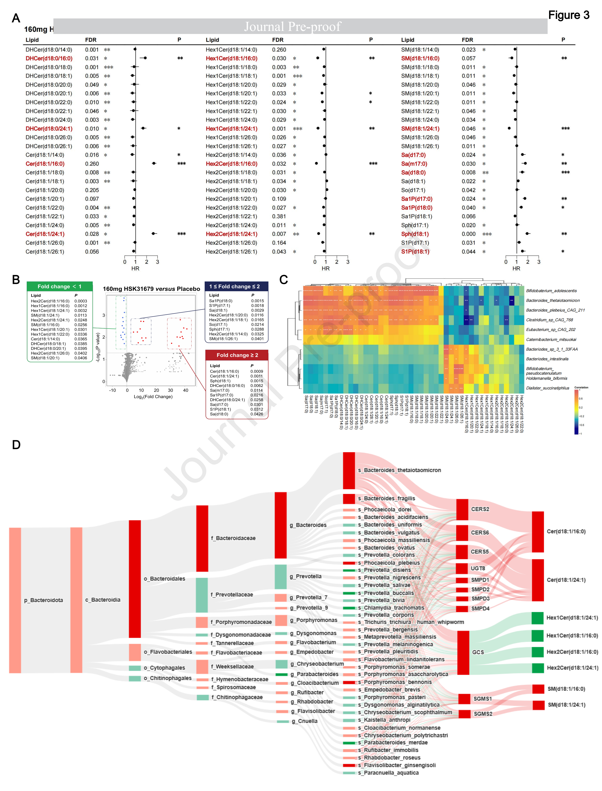 隨后通過(guò)LEfSe分析探索了HSK31679治療組14天與安慰劑組相比的腸道菌群差異,這進(jìn)一步揭示了桿菌屬的最大增量(圖2B,C)。值得注意的是,在第14天上升劑量為80mg、120mg、160mg HSK31679后,B. thetaiotaomicron的相對(duì)豐度表現(xiàn)出最明顯的逐漸上升(圖2C),并通過(guò)qPCR進(jìn)行了驗(yàn)證(圖2D),這表明B.thetaiotaomicron可能在HSK31679治療期間發(fā)揮關(guān)鍵中介作用。KEGG通路分析富集了20個(gè)信號(hào)通路的154個(gè)功能基因,其中神經(jīng)酰胺代謝被HSK31679處理激活(圖2E)。這些顯著的成分變化與以前對(duì)晚期脂肪性肝炎患者微生物種群負(fù)相關(guān)的研究一致。
