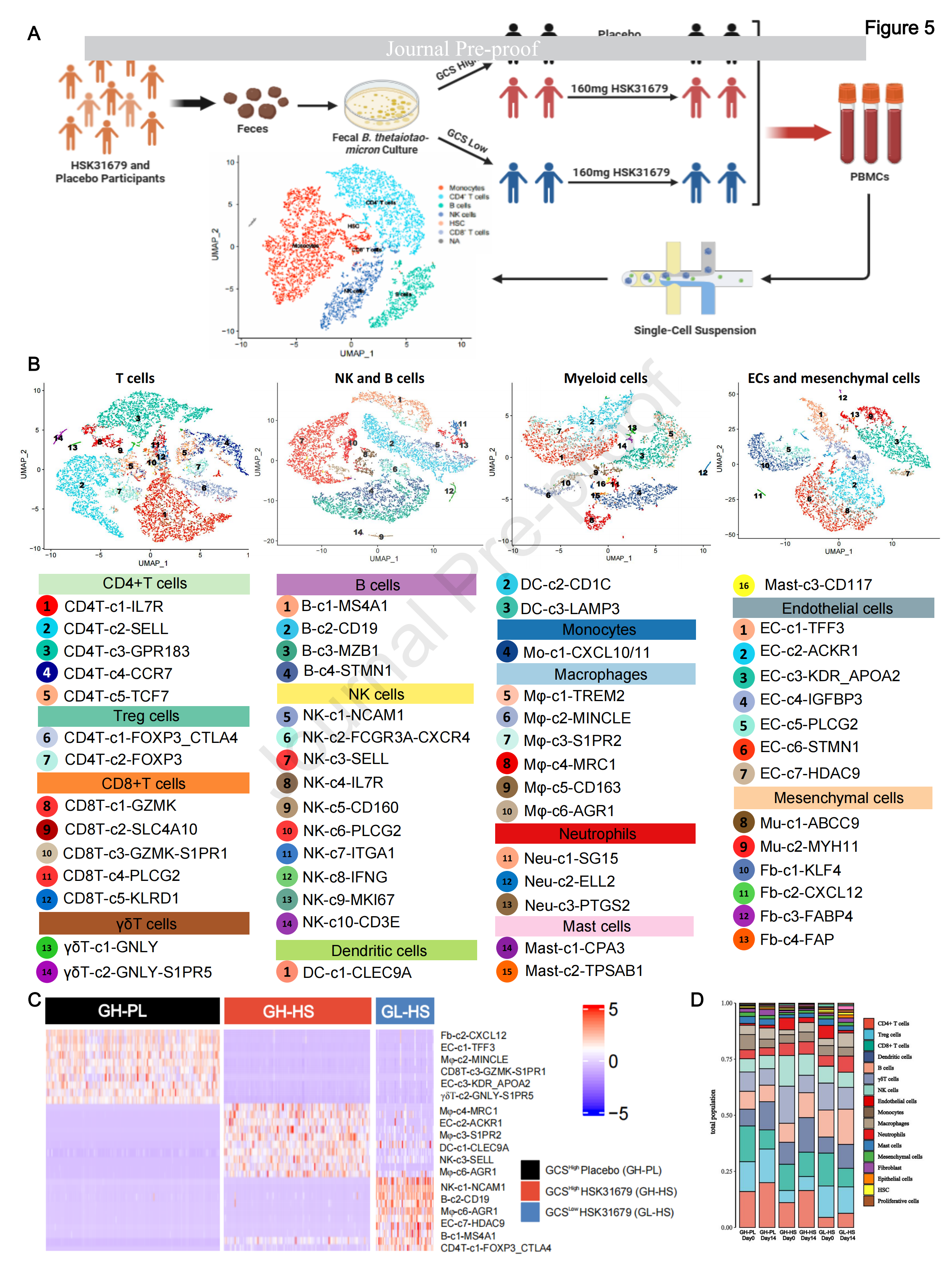 為了深入了解腸道微生物GCS在所有免疫細(xì)胞群中治療HSK31679的獨(dú)特免疫作用,研究者使用基于液滴的單細(xì)胞平臺(tái)(10×Genomics Chromium)進(jìn)行了單細(xì)胞轉(zhuǎn)錄組測(cè)序(scRNA-seq),分析了來(lái)自參與者隊(duì)列的18個(gè)外周血單核細(xì)胞(PBMC)樣本,包括3個(gè)用安慰劑(GH-PL)治療的糞便來(lái)源GCS高活性樣本、3個(gè)用160 mg HSK31679(GH-HS)治療的糞便來(lái)源GCS高活性樣本,和GCS低活性樣本(GL-HS)分別在第0天和第14天。從GH-PL、GH-HS、GL-HS數(shù)據(jù)集中獲得的128031個(gè)細(xì)胞中,共鑒定出57個(gè)細(xì)胞簇。通過(guò)SingleR v.1.0獲得的基于標(biāo)記的注釋,定義了四種主要的細(xì)胞類型:T細(xì)胞、自然殺傷細(xì)胞(NK)和B細(xì)胞、髓系細(xì)胞、內(nèi)皮細(xì)胞(EC)和間充質(zhì)細(xì)胞(圖5B)。通過(guò)計(jì)算觀察到的細(xì)胞數(shù)與預(yù)期細(xì)胞數(shù)的比值(Ro/e)來(lái)量化主要細(xì)胞團(tuán)相對(duì)不同的富集情況,發(fā)現(xiàn)髓系細(xì)胞團(tuán)構(gòu)成了GH-HS的主要改變的細(xì)胞成分,B細(xì)胞、EC團(tuán)主導(dǎo)了GL-HS樣本的細(xì)胞成分(圖5C、D和圖S8C)。鑒于如上所述,HSK31679治療通過(guò)B.thetaiotaomicron的GCS減輕了脂肪性肝炎,在隨后分析GH-HS和GL-HS之間的特定細(xì)胞區(qū)室時(shí)重點(diǎn)研究了髓系細(xì)胞。