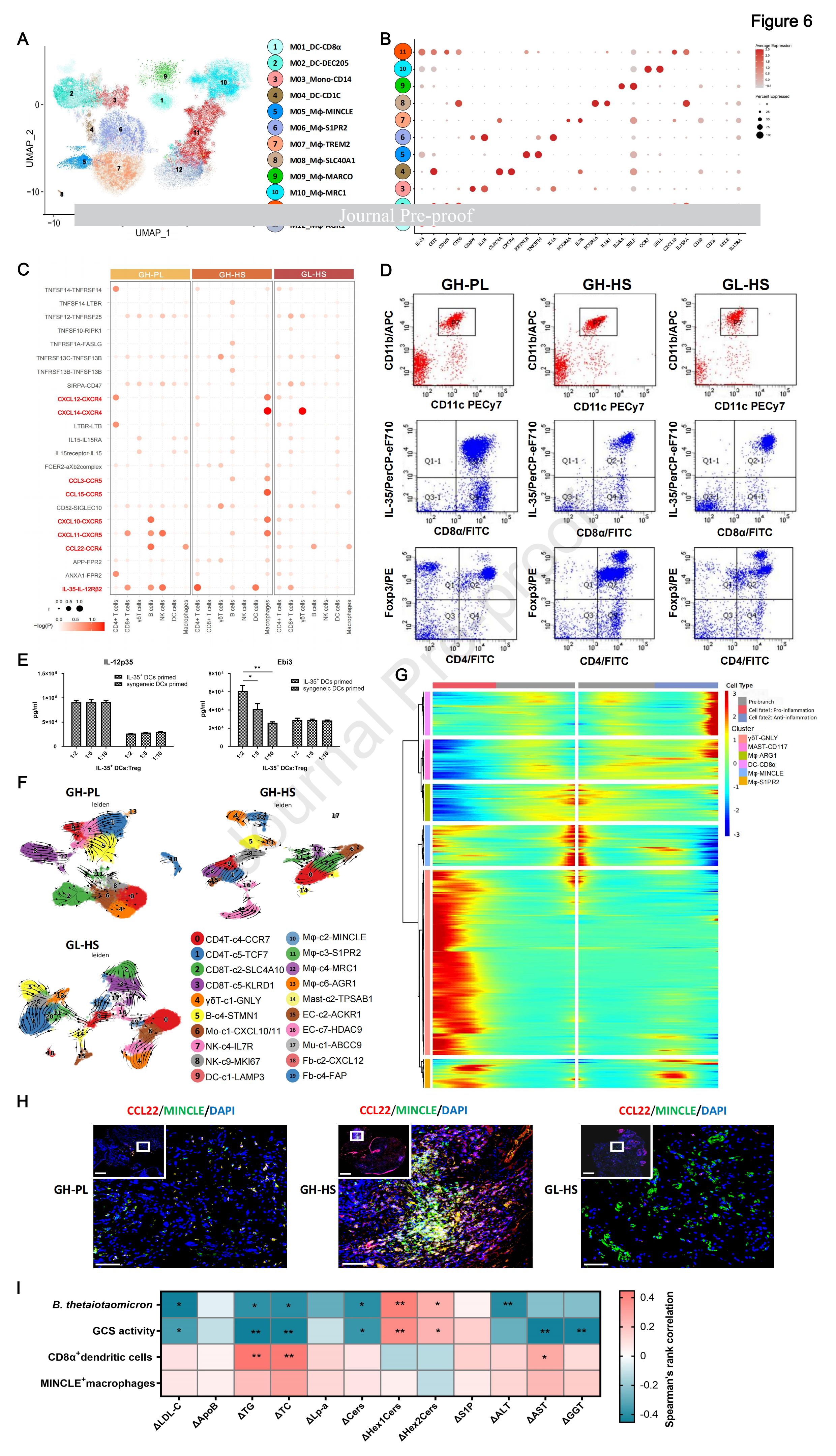 在所有髓系細(xì)胞亞群中,樹突狀細(xì)胞 (DC) 和巨噬細(xì)胞 (Mφ) 構(gòu)成了主要細(xì)胞類型(圖 5B)。通過(guò)無(wú)監(jiān)督聚類,首先關(guān)注 DCs 群體的內(nèi)在屬性和潛在功能,這些 DCs 群體被確定為減少的 CD8α+DCs(圖 6A、D)。值得注意的是,GH-HS 組中 Tregs 的 IL-12Rβ2 可以與 CD8α+DCs 衍生的 IL-35 相互作用(圖 6B、C)。如先前報(bào)道的那樣,可以增強(qiáng)炎癥過(guò)程的抑制功能。與GL-HS或GH-PL數(shù)據(jù)集相比,GH-HS的PBMCs中CD4+Foxp3+Tregs的數(shù)量增加(圖6D)。這些Tregs的抑制功能阻斷了IL-35的EBI3亞基的作用(圖6E),導(dǎo)致免疫原性顯著受損。這可能是由于STAT1/STAT3的異常激活和p38 MAPK/NF-κB信號(hào)通路的抑制(圖S8D和E)。此外,注意到DC簇的分布與γ-谷氨酰轉(zhuǎn)移酶(GGT)的表達(dá)相關(guān)(圖6B),GGT是MASH進(jìn)展的公認(rèn)血清生物標(biāo)志物。在GH-HS的所有DC中(圖6A),GGT+樣本中CD1C+DCs(cDC2)的比例顯著增加,而與GL-HS或GH-PL組相比,DEC205+DCs(cDC1)的比例降低。盡管之前的研究報(bào)告了cDCs在促進(jìn)或抑制脂肪性肝炎中的不確定作用,但結(jié)果表明,cDC1和cDC2細(xì)胞對(duì)HSK31679治療的反應(yīng)方式相反。