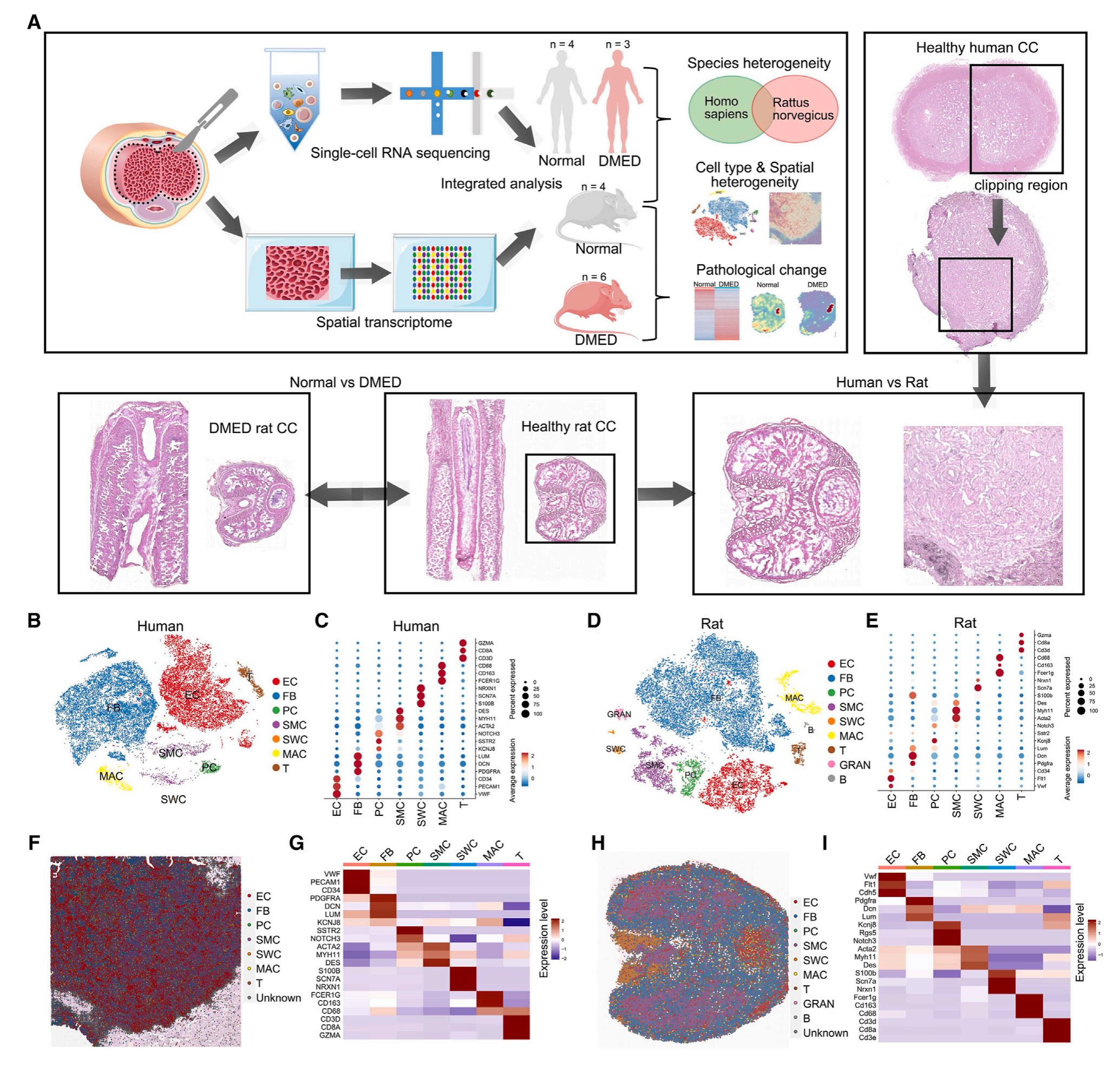 圖1-通過scRNA-seq和空間轉錄組技術得到的人類,以及正常/DMED條件下大鼠的CC細胞全局表達譜