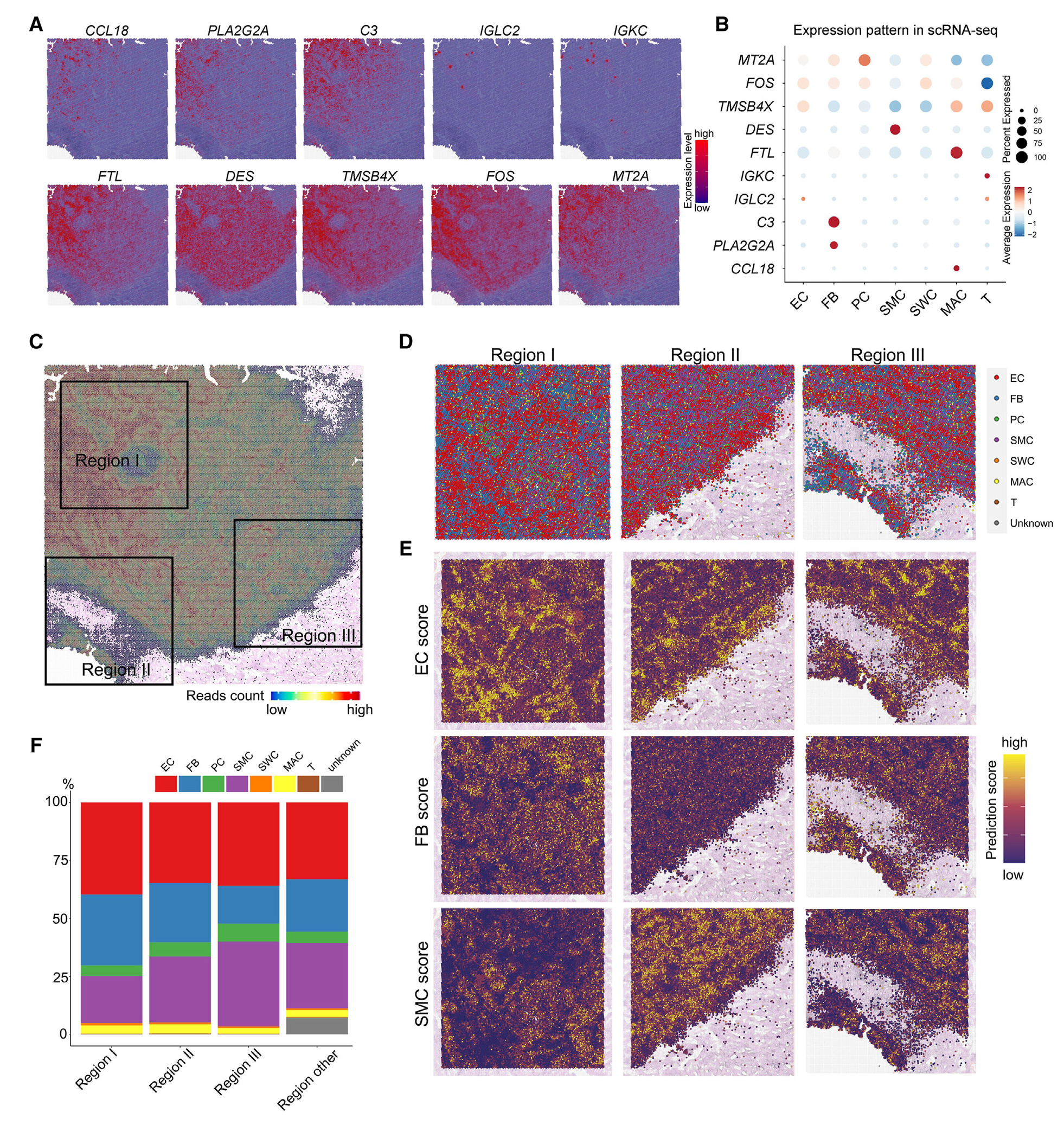 近期,CC的FB(成纖維細胞)成為研究熱點,但對其空間和物種異質性仍不清楚。研究者根據(jù)PI16、APOE及其他載脂蛋白、COMP的表達情況,將人類CC FB分成3種亞群。空間轉錄組數(shù)據(jù)分析結果顯示,人類CC中3種FB亞群空間分布模式不同,富集的功能也不同;大鼠CC FB表現(xiàn)出與人類CC FB相似的亞群和標志基因,但每種亞群的比例與人類顯著不同。