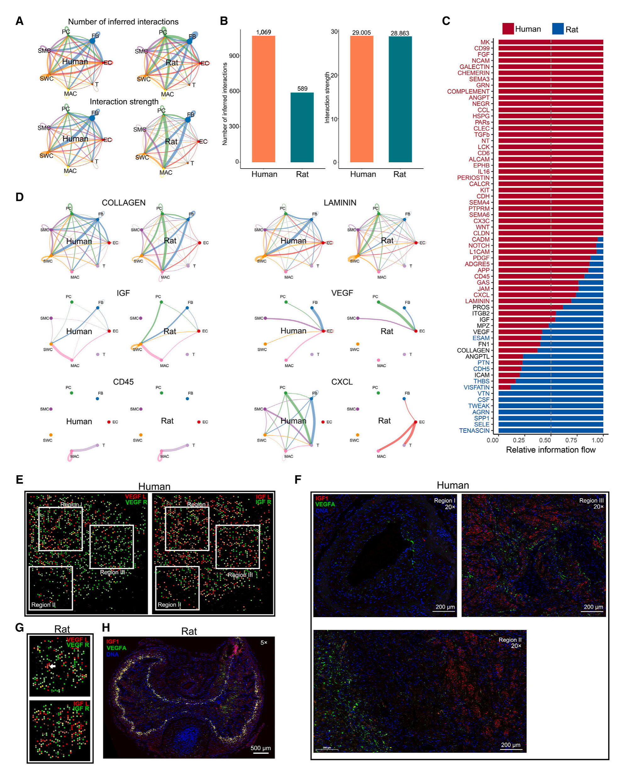 為了研究、比較人類和大鼠間CC微環(huán)境的復雜信號網(wǎng)絡,研究者使用scRNA-seq數(shù)據(jù)進行CellChat分析,發(fā)現(xiàn)大鼠CC中的細胞互作數(shù)量雖然小于人類,但細胞互作強度是相似的?;谶@些互作的表達模式,研究者進行簡單的分類,發(fā)現(xiàn)雖然胞外基質相關的互作整體強度與細胞類型間配體-受體強度相當,但兩者基因組成是有差異的;血管生成相關的互作整體強度在人類和大鼠中沒有差異,但基因組成存在差異,如大鼠CC微環(huán)境中是主要是VEGFB表達,而人類CC微環(huán)境中高表達的是VEGFA和IGF1。
