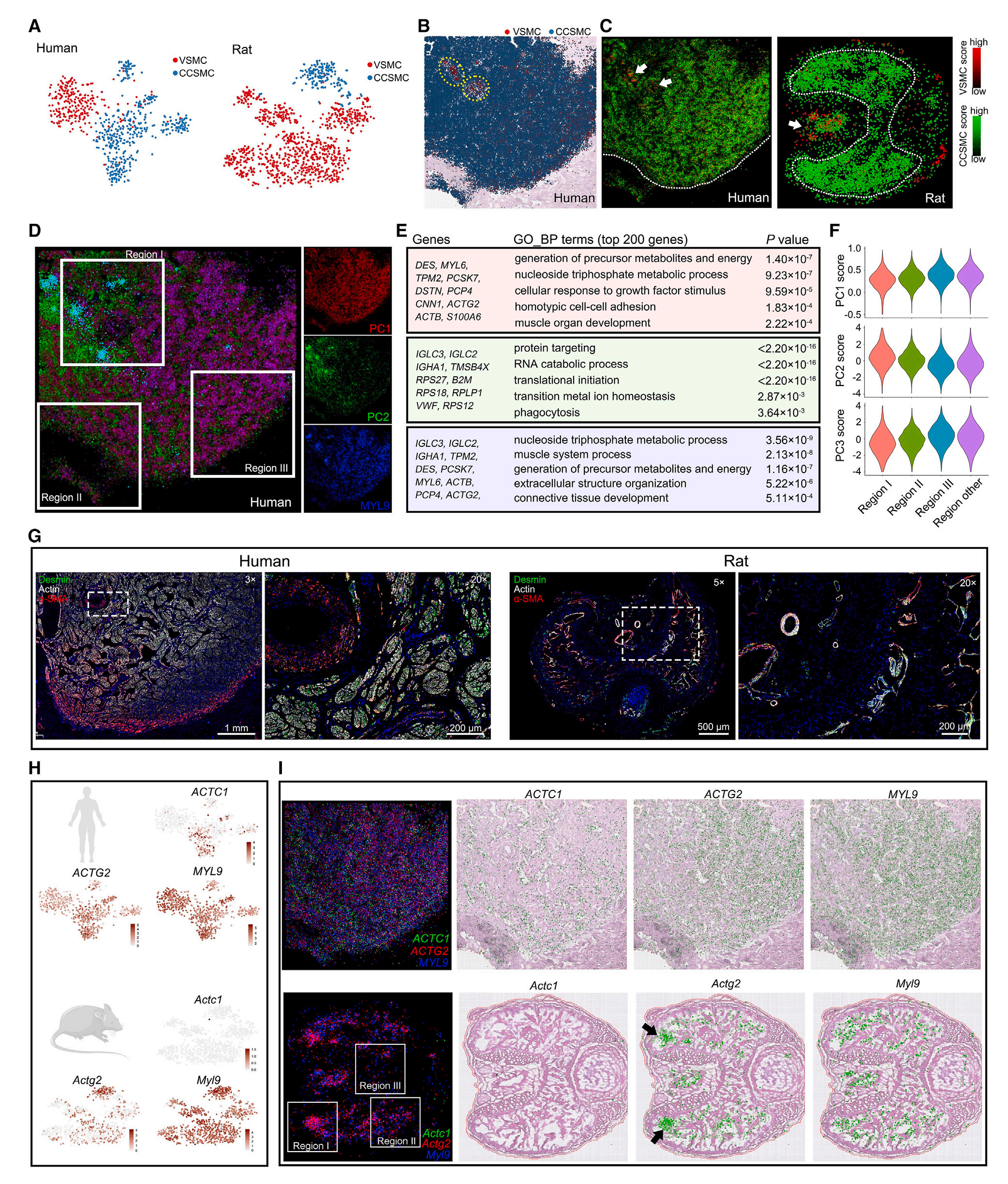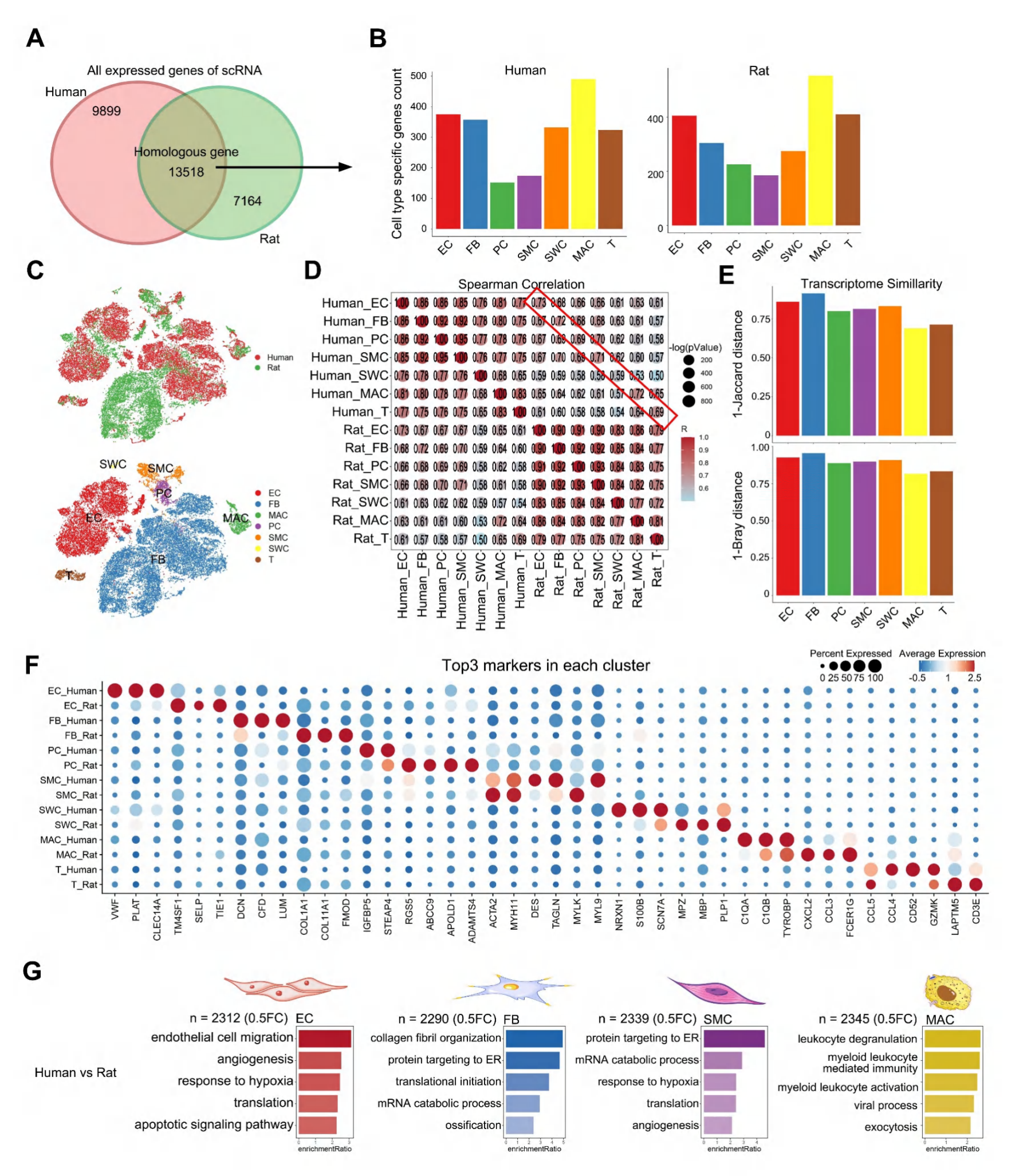通過分析空間轉錄組數(shù)據(jù)中的人—鼠同源基因,研究者找到人類和大鼠共有的459個top SVG,大多數(shù)SVG并不是細胞類型特異的,其中EC、FB和SMC是表達這些SVG最多的3種類型細胞。富集分析結果顯示,基礎生物學過程如“translational initiation”、“extracellular structure organization”以及“protein targeting”,在人類和大鼠CC組織的空間轉錄組數(shù)據(jù)中是保守的;人類特異SVG主要與炎癥響應有關,而這些SVG的大鼠同源基因主要與代謝過程有關。