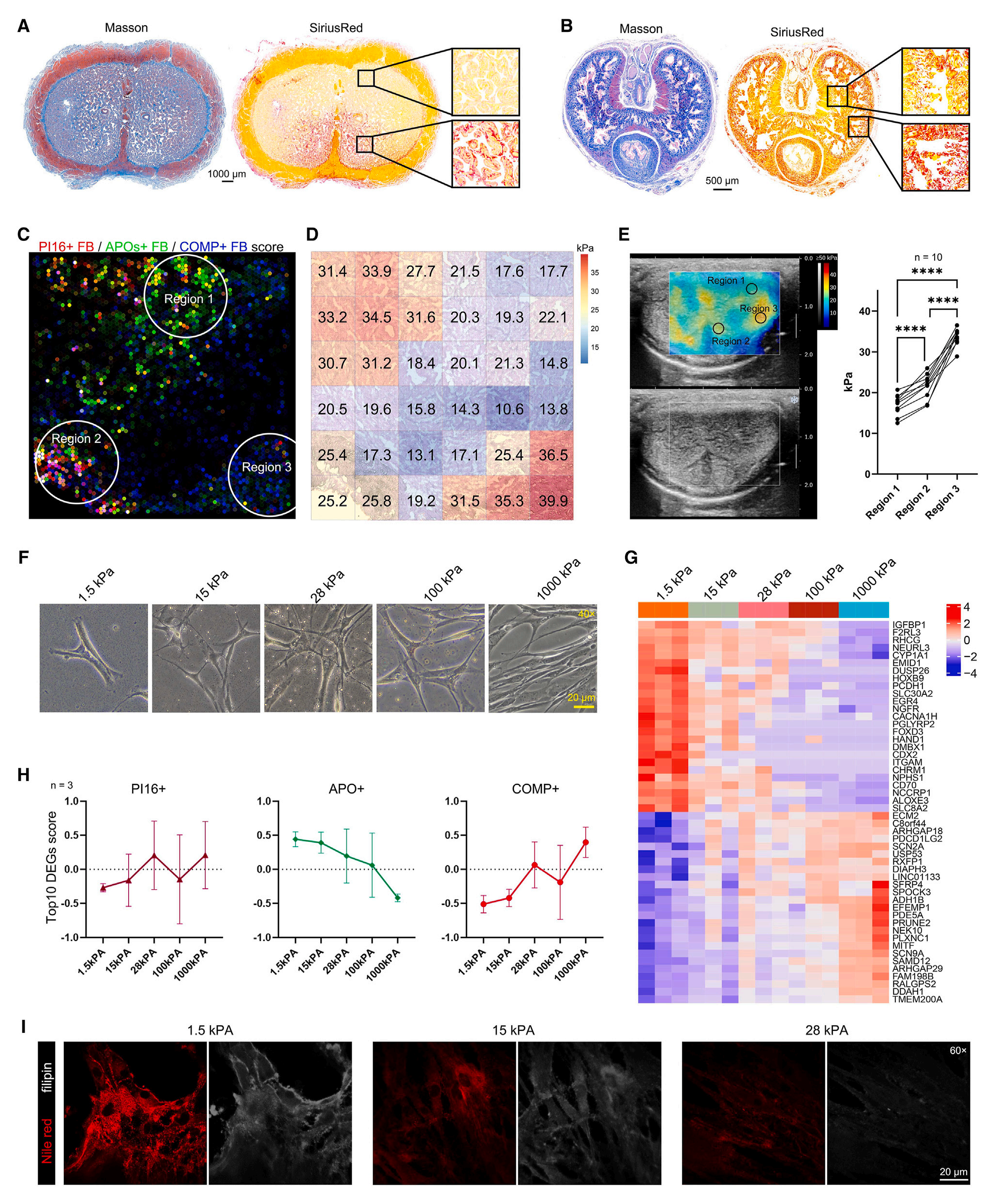 本研究中,研究者發(fā)現(xiàn)COMP+ FB生態(tài)位顯著富集了“integrin-mediated signaling pathway”和“response to mechanical stimulus”term;人和大鼠CC中ECM/細胞組成比例表現(xiàn)出明顯的空間異質性;空間轉錄組數(shù)據(jù)和免疫熒光染色結果類似,靠近陰莖背神經(jīng)血管束的上極區(qū)域顯示出較低的纖維化水平,而遠離背神經(jīng)血管束的顯示出較高的纖維化水平;空間轉錄組數(shù)據(jù)和超聲彈性成像結果都表明,APO+ FB與更柔軟的組織硬度有關,而COMP+ FB與更硬的組織有關;不同胞外基質硬度培養(yǎng)下的CC FB形態(tài)不同,bulk RNA-seq數(shù)據(jù)顯示機械應激顯著改變了FB的轉錄狀態(tài),一些參與調(diào)控脂質代謝的基因與低機械力信號有關;scRNA-seq數(shù)據(jù)分析結果顯示APO+ FB分值隨組織硬度增加而降低,COMP+ FB分值隨組織硬度增加而增加;染色結果顯示隨著組織硬度增加,F(xiàn)B中的中性脂質和膽固醇累積降低。