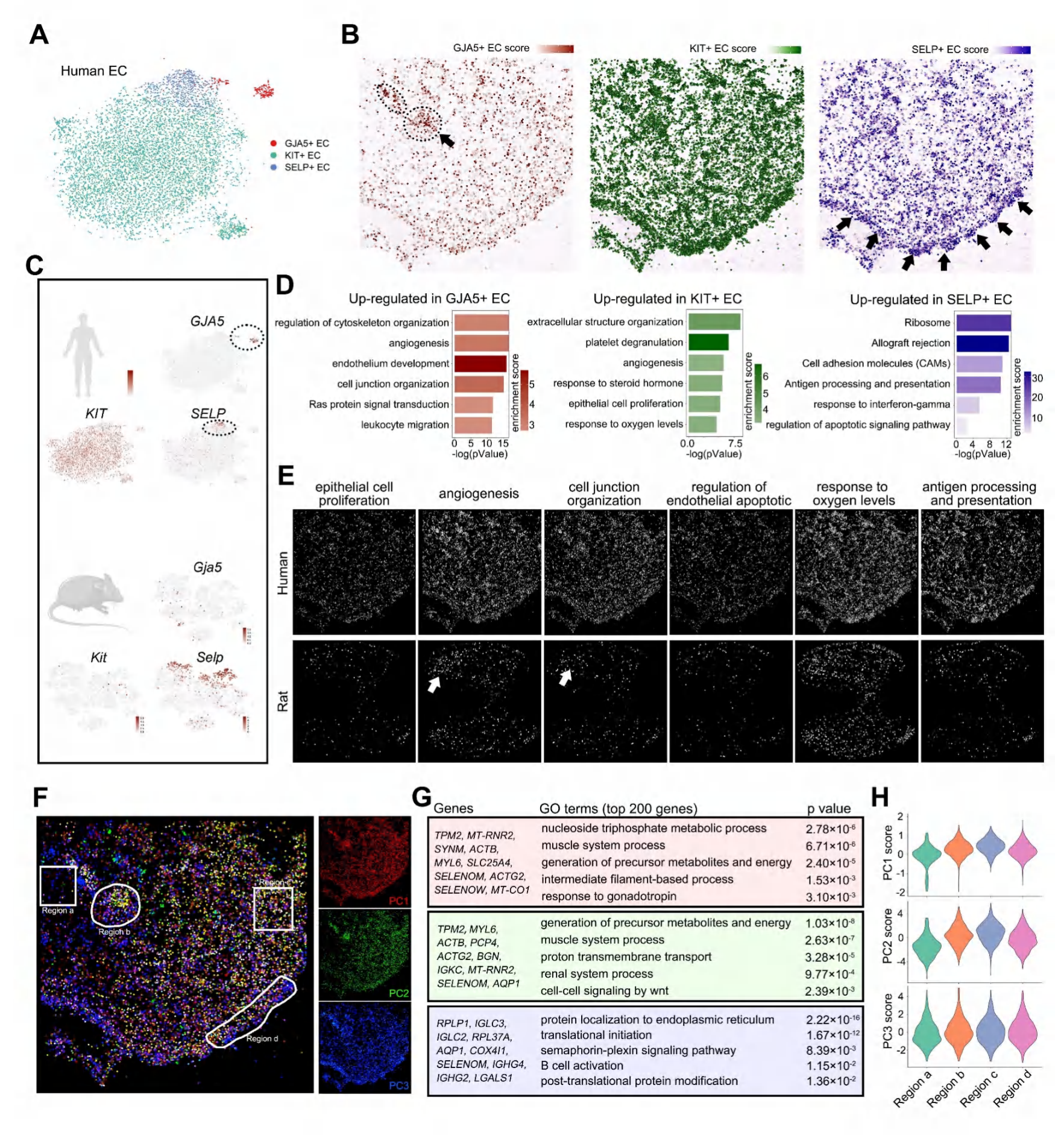 根據(jù)以往的解剖觀察以及scRNA-seq數(shù)據(jù)分析,可知CC中包含3種類型EC(內(nèi)皮細胞),包括GJA5+ EC(動脈內(nèi)皮細胞)、SELP+ EC(靜脈內(nèi)皮細胞)以及KIT+ EC(海綿體竇內(nèi)皮細胞)。人類CC中GJA5+ EC占比最低,主要分布在海綿體動脈區(qū)域;SELP+ EC主要分布在白膜區(qū)域;KIT+ EC廣泛分布。但大鼠CC中,Selp+ EC比例更高,Gja5和Kit可能并不是有用的靜脈和CC內(nèi)皮細胞標志物?;趕cRNA-seq數(shù)據(jù)進行GO分析,研究者發(fā)現(xiàn)不同類型EC富集了不同功能,多數(shù)細胞類型特異性的term(條目)在人類CC中并沒有空間分布異質性,但一些特殊term在大鼠CC中表現(xiàn)出空間分布異質性。