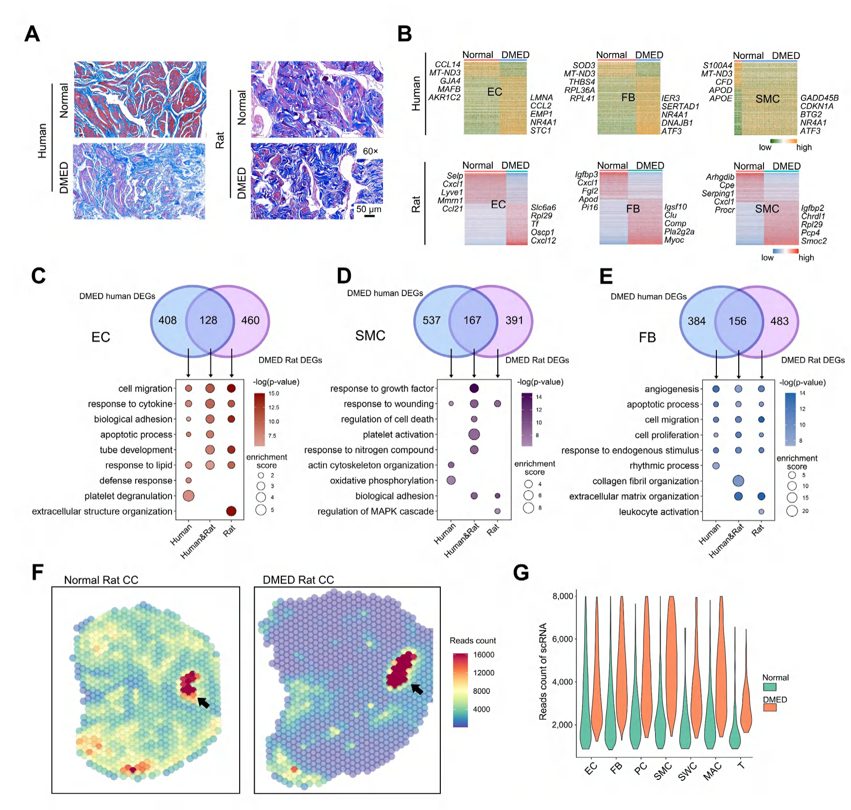 為了更好的認識DMED病理條件下,人類和大鼠CC微環(huán)境發(fā)生的變化是否與每種CC細胞類型中發(fā)生的分子水平變化相一致,研究者通過分析scRNA-seq數(shù)據(jù),發(fā)現(xiàn)DMED大鼠模型和DMED患者都經(jīng)歷了顯著的纖維化以及細胞組分丟失,但兩者間的轉錄組差異顯著。富集分析結果顯示,僅DMED大鼠模型富集了“extracellular structure organization”;“actin cytoskeleton or organization”和“oxidative phosphorylation”僅在人類DMED患者SMC中發(fā)現(xiàn),“regulation of MARK cascade”僅在DMED大鼠模型SMC中富集;“rhythmic process”僅在人類DMED患者FB中富集,“l(fā)eukocyte activation”僅在DMED大鼠模型FB中富集。