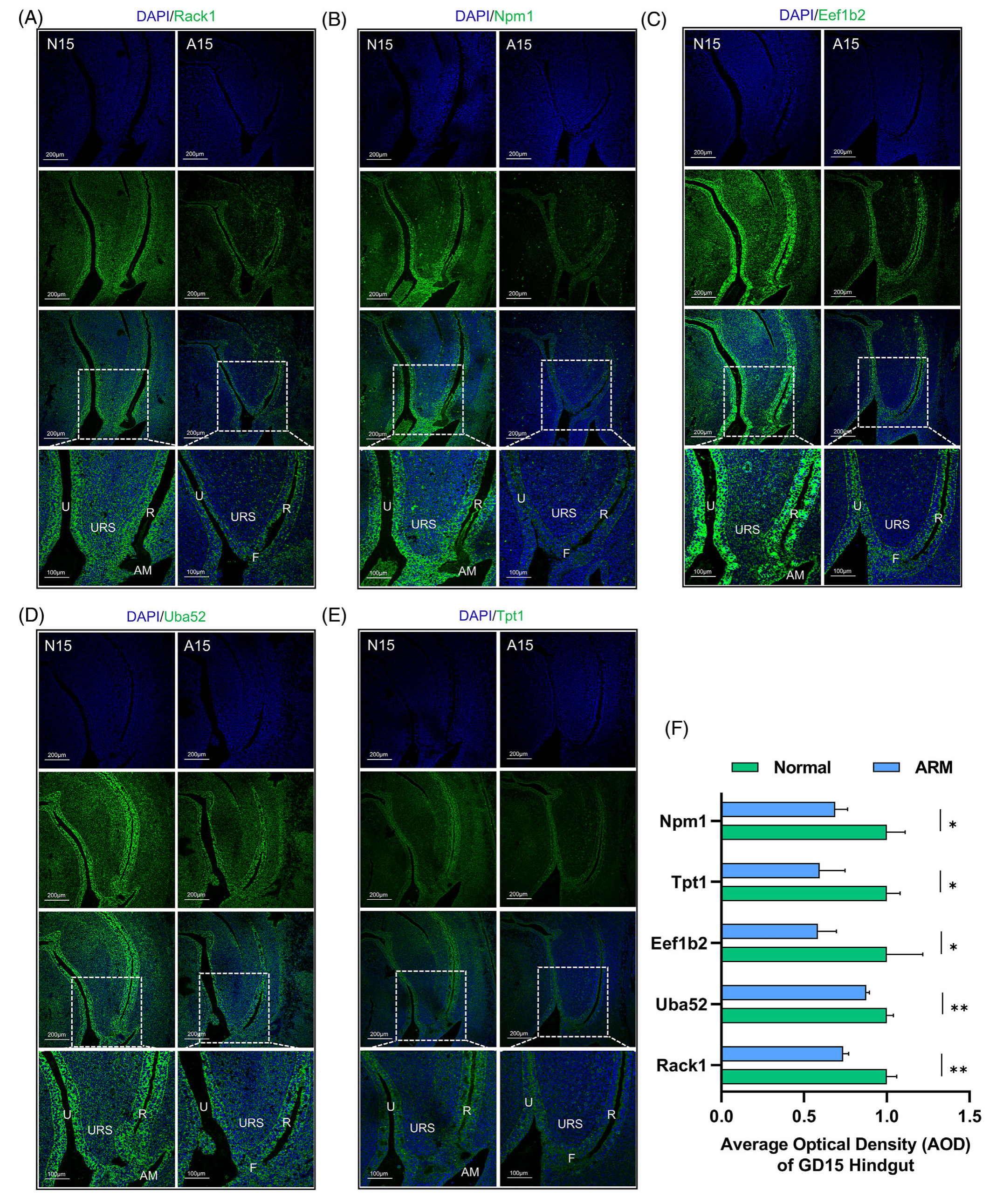 圖 2A-E 全面說明了 GD15 截面泄殖腔區(qū)域中前五個基因的蛋白質(zhì)表達模式和定位:Rack1、Npm1、Eef1b2、Uba52?和?Tpt1。這些數(shù)字是使用免疫熒光染色獲得的。值得注意的是,這 5 種蛋白質(zhì)在 N15 泄殖腔區(qū)域的尿道和后腸上皮內(nèi)均表現(xiàn)出位點特異性表達。除?Tpt1?外,其他 4 種蛋白在 AM 區(qū)域內(nèi)表現(xiàn)出表達水平升高。此外,觀察到這些蛋白質(zhì)離散分布在 URS 的下肢和后腸的間質(zhì)附近。相比之下,這五種蛋白的表達在 A15 泄殖腔區(qū)域的尿道和后腸上皮內(nèi)明顯下降,伴隨著尿道直瘺部位的表達水平降低 (p < 0.05)。圖 2F 顯示了平均光密度 (AOD) 的半定量評估,特別是在后腸結(jié)構(gòu)域內(nèi)。