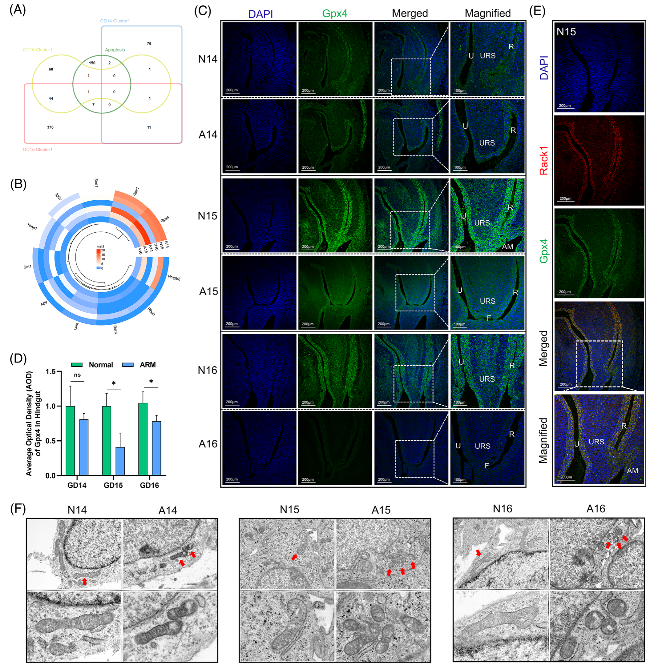 在基因集富集分析(GSEA)數(shù)據(jù)庫中,細(xì)胞死亡基因集包含161個基因,其中 7 個細(xì)胞死亡相關(guān)基因是從基因集與GD 15上簇1中的 DEGs 交集中獲得的(圖 4A)。圓形熱圖顯示了與聚類1的6個樣本相同區(qū)域內(nèi)的細(xì)胞死亡基因的表達譜。值得注意的是,發(fā)現(xiàn)谷胱甘肽過氧化物酶家族的關(guān)鍵成員?Gpx4?在 GD 15 的簇 1 中下調(diào)(p < 0.05;圖 4B)。免疫熒光染色顯示 Gpx4 蛋白在尿道和后腸上皮以及 AM 區(qū)域的顯著定位,在 URS 中觀察到的分布相對較淺。在 ARM 組的泄殖腔中觀察到 Gpx4 陽性信號的減少(圖 4C)。AOD 分析表明,在 GDs 15 和 16 上,后腸中 Gpx4 表達在統(tǒng)計學(xué)上顯著降低(p < 0.05;圖 4D)。