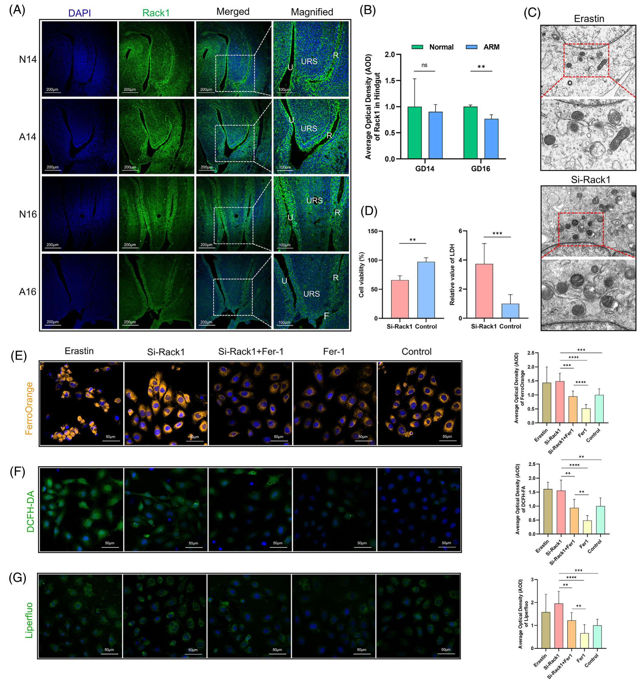 N15 胚胎石蠟切片的雙免疫熒光染色顯示 Rack1 和 Gpx4 蛋白在尿道和后腸上皮內(nèi)共定位。該結(jié)果表明 Rack1 在調(diào)節(jié)這些組織中的鐵死亡中的潛在作用 (圖 4E)。隨后,進行顯微解剖以獲得正常和 ARM 胚胎的后腸組織。透射電子顯微鏡 (TEM) 顯示 ARM 組細(xì)胞線粒體體積減小,線粒體密度增加,線粒體嵴減少。這些觀察結(jié)果與與鐵死亡發(fā)生相關(guān)的線粒體形態(tài)變化一致(圖 4F)。