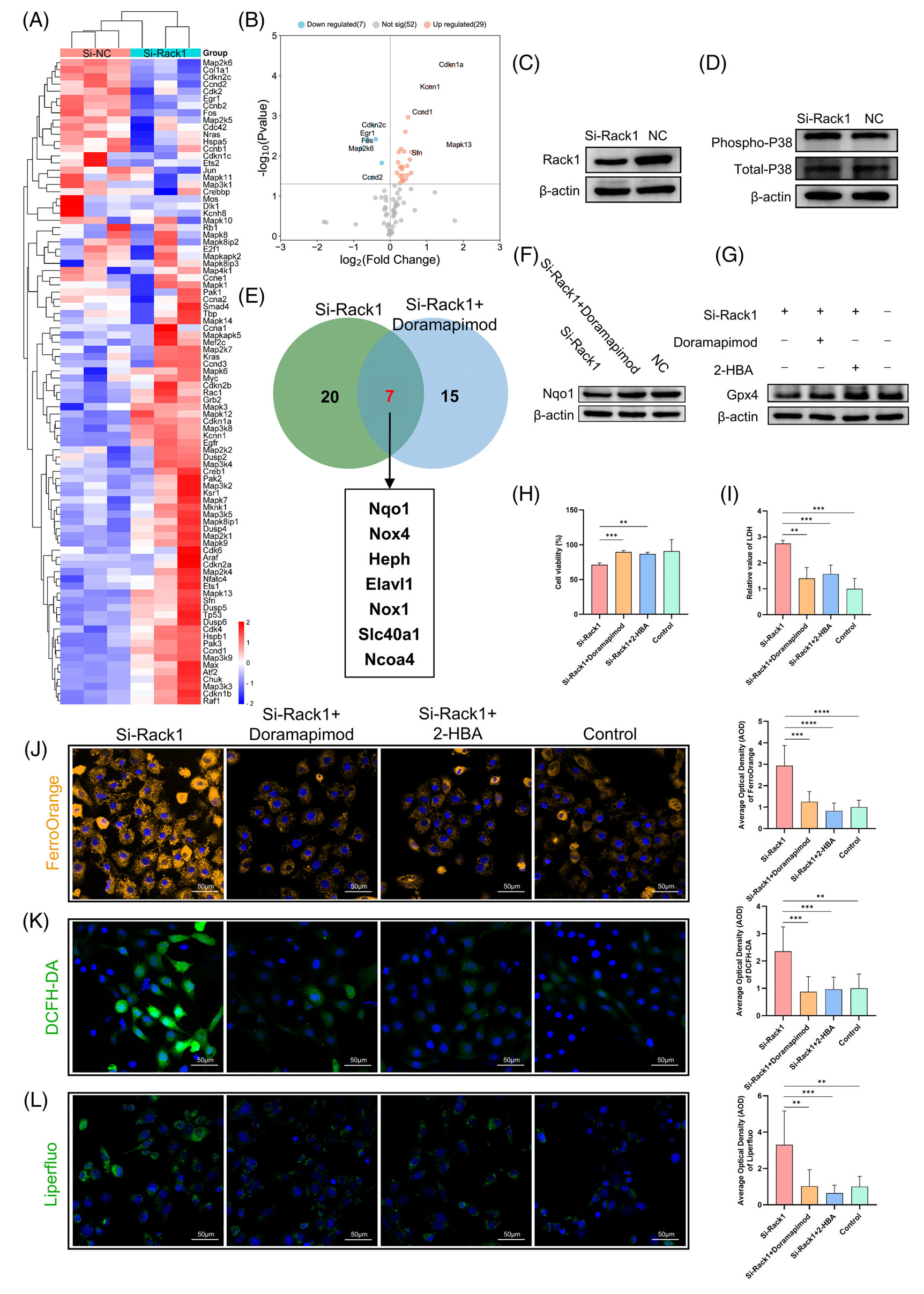圖6-Rack1 敲低可增強 P38 磷酸化并調(diào)節(jié)下游 Nqo1/Gpx4 表達