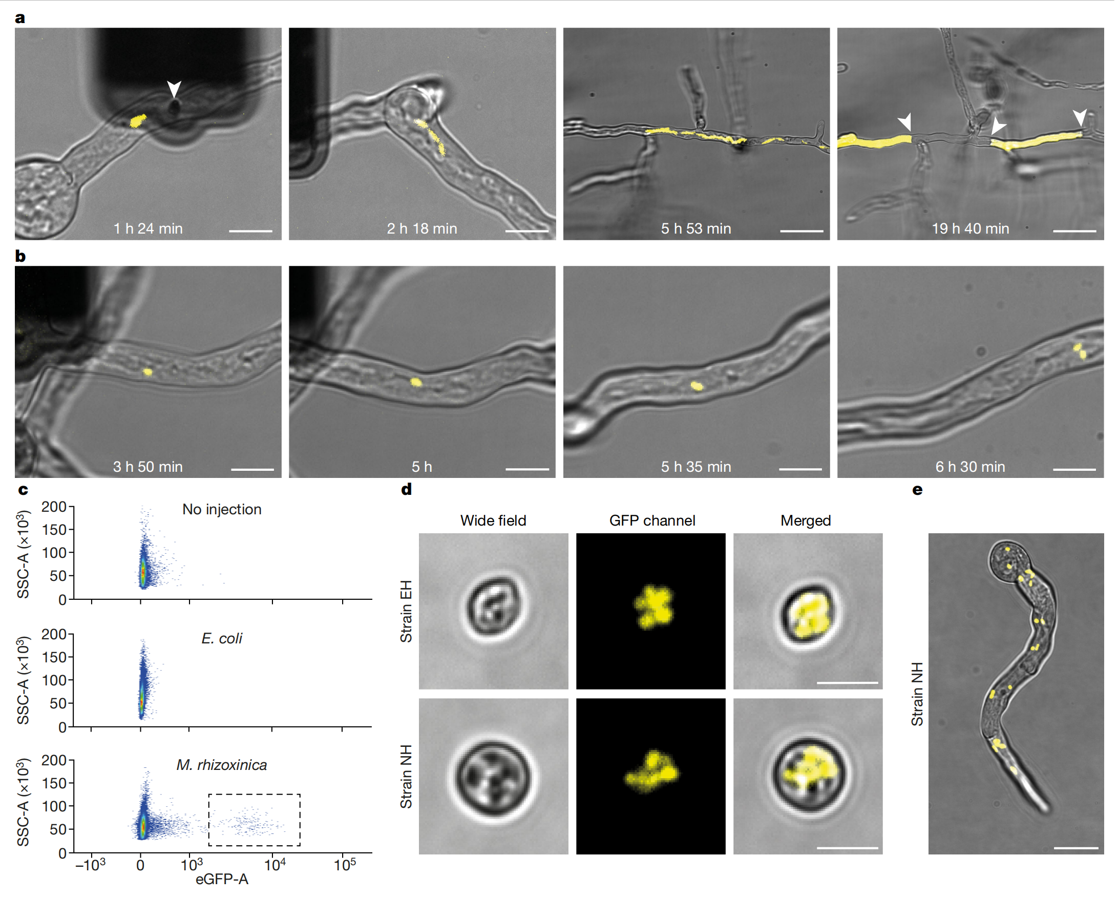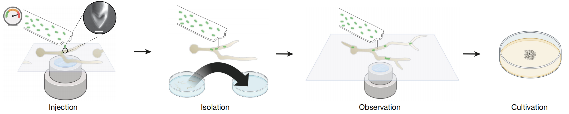 使用 FluidFM 技術(shù),在不破壞真菌小孢根霉(R. microsporus)細(xì)胞的情況下將細(xì)菌植入其中,通過(guò)該技術(shù),單次注射可將1-30個(gè)細(xì)菌注入R. microsporus內(nèi),同時(shí)可通過(guò)實(shí)時(shí)成像觀察人工誘導(dǎo)的內(nèi)共生現(xiàn)象的命運(yùn)。用GFP標(biāo)記的M. rhizoxinica注射入EH型絲狀真菌,細(xì)菌成功在絲狀真菌內(nèi)定殖并能垂直傳遞(遺傳),表明通過(guò)注射方法可以重建自然內(nèi)共生。