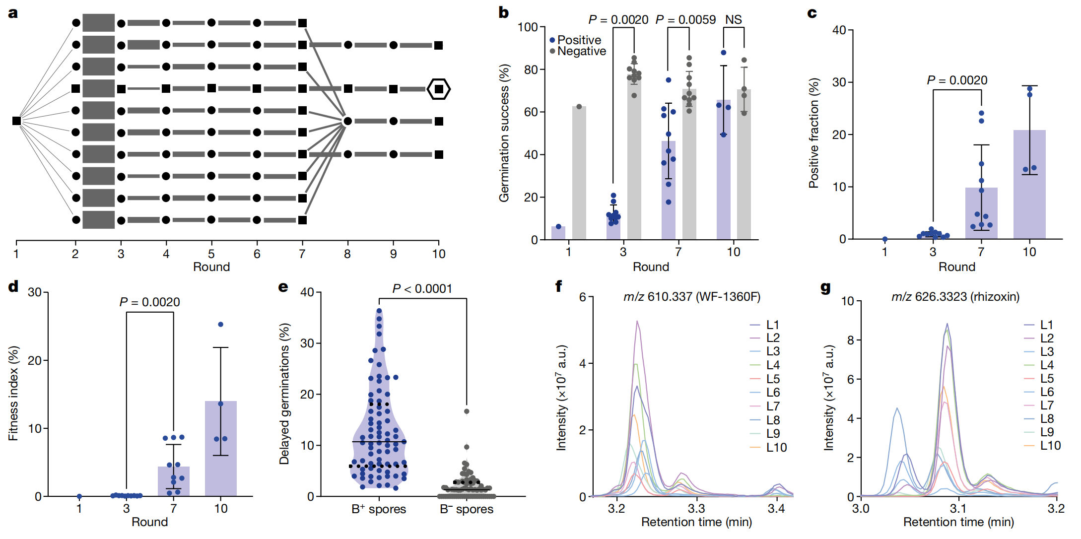 為進(jìn)一步提高人工誘導(dǎo)的NH-根霉生菌內(nèi)共生體系的遺傳穩(wěn)定性,進(jìn)行多輪生長(zhǎng)和篩選,以施加正向選擇壓力。隨著進(jìn)化過(guò)程的進(jìn)行,攜帶細(xì)菌的孢子的萌發(fā)率逐漸提高,并且攜帶細(xì)菌的孢子的比例也顯著增加,而真菌也在適應(yīng)性進(jìn)化過(guò)程中發(fā)生了基因突變,這些突變可能與內(nèi)吞作用有關(guān),這與共生關(guān)系的穩(wěn)定性和適應(yīng)性的提高相一致。需要注意的是,由于真菌基因組研究不足,且存在潛在的表觀遺傳效應(yīng),這些推測(cè)仍需進(jìn)一步驗(yàn)證。在適應(yīng)性進(jìn)化后的共生關(guān)系中,M. rhizoxinica?能在新的宿主菌株 NH 中能夠產(chǎn)生次級(jí)代謝產(chǎn)物 WF-1360F,而根霉菌株 NH 能夠?qū)?WF-1360F 轉(zhuǎn)化為 rhizoxin。這表明,通過(guò)誘導(dǎo)內(nèi)共生可以將新的代謝功能轉(zhuǎn)移到宿主中。
