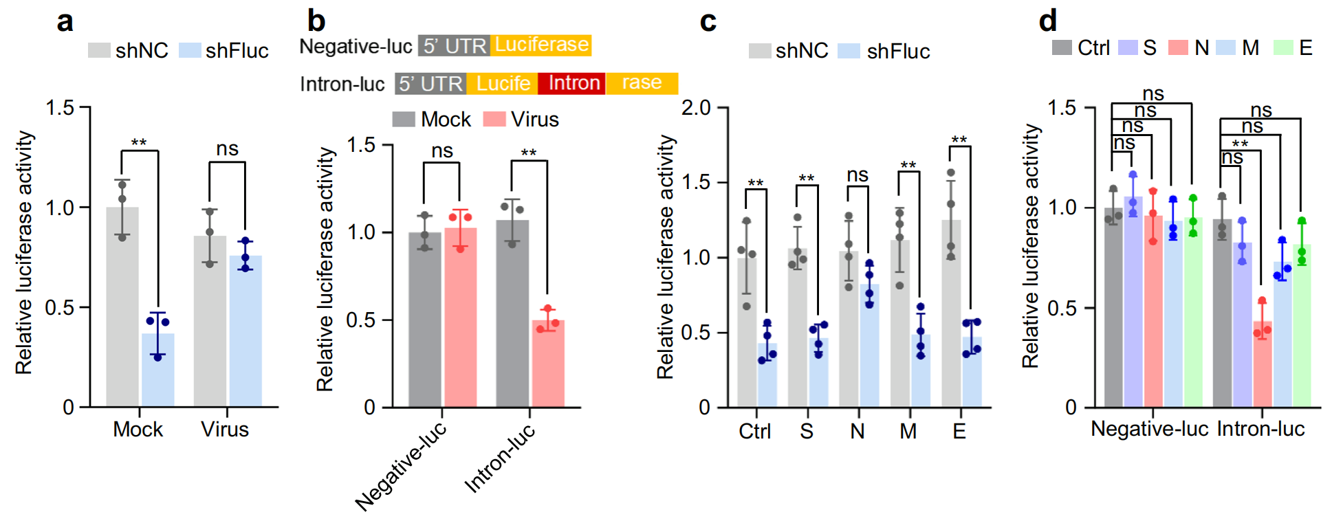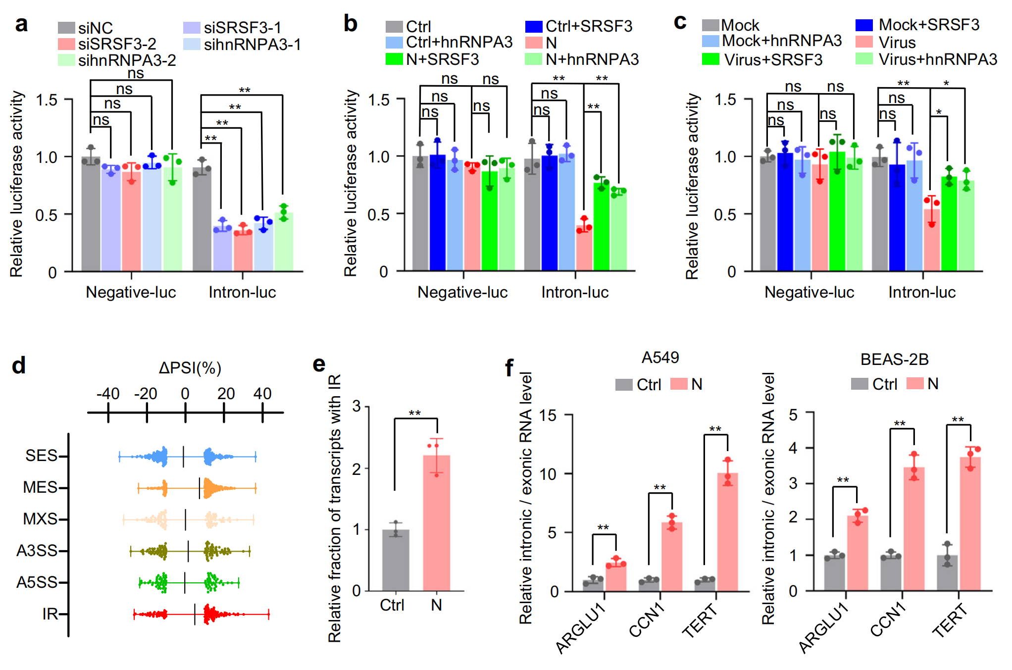 SRSF3或hnRNPA3敲除抑制了含有內(nèi)含子的報告基因小基因的剪接,證實了它們確實是剪接因子,而它們的過表達部分緩解了 N 蛋白或 SARS-CoV-2 感染對 RNA 剪接的抑制作用,進一步進行全長轉(zhuǎn)錄組測序,通過可變剪接分析發(fā)現(xiàn),N 蛋白誘導內(nèi)含子保留。此外,RT-qPCR證實,異位 N 蛋白表達或 SARS-CoV-2 感染降低了一組內(nèi)源性內(nèi)含子的剪接效率,SRSF3?和?hnRNPA3?過表達部分減輕了 N 蛋白和 SARS-CoV-2 對 RNA 剪接的抑制作用,這些結(jié)果表明,N 蛋白通過降低?SRSF3?和?hnRNPA3?的表達來抑制 RNA 剪接。