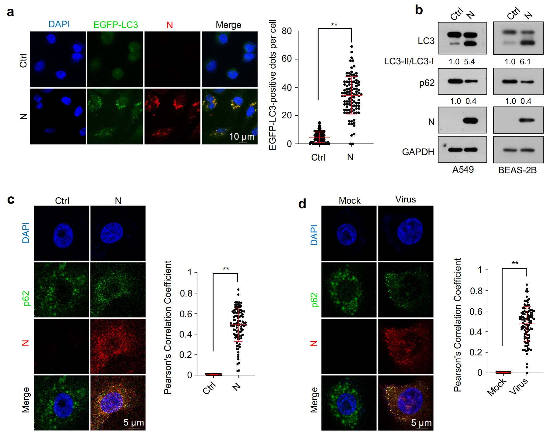 在 BioGRID 數(shù)據(jù)庫中找到了一種自噬受體蛋白SQSTM1/p62 ,共聚焦顯微鏡分析和免疫共沉淀分析分別證實了 N 蛋白和 p62 之間的相互作用及其共定位,p62 敲低部分緩解了 N 蛋白誘導的?Dicer、XPO5、SRSF3?和?hnRNPA3?蛋白的下調(diào);然而,它不會影響不表達 N 蛋白的細胞中的?Dicer、XPO5、SRSF3?或?hnRNPA3?蛋白水平,表明?p62 通過與 N 蛋白的相互作用將 N 蛋白相互作用蛋白(包括?Dicer、XPO5、SRSF3?和?hnRNPA3)募集到吞噬細胞中,導致自噬降解。