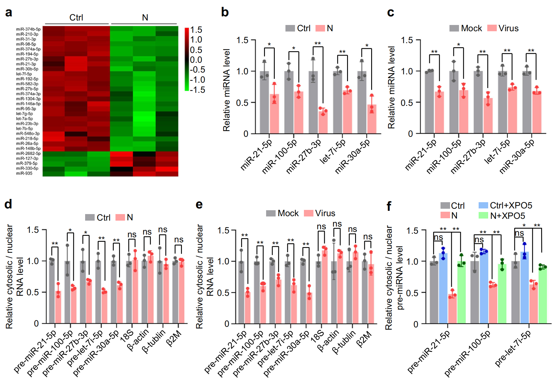 XPO5和Dicer在 miRNA 生物合成中起關(guān)鍵作用,小 RNA 深度測序顯示,N 蛋白誘導 miRNA 表達的整體下調(diào),對 A549 和 BEAS-2B 細胞中表達量最高的前五個 miRNA進行定量驗證顯示,它們在表達 N 蛋白的細胞和 SARS-CoV-2 感染的細胞中均下調(diào);生化分級分離實驗顯示,異位 N 蛋白表達或 SARS-CoV-2 感染誘導 pre-miRNA 的核保留,如細胞核中 pre-miRNA 水平的增加和細胞質(zhì)中 pre-miRNA 水平的降低所示,?XPO5過表達后得到緩解。此外,異位 N 蛋白表達或 SARS-CoV-2 感染降低了成熟 miRNA 和 pre-miRNA 之間的比率,Dicer過表達后得到緩解??傮w而言,這些發(fā)現(xiàn)表明,N 蛋白通過降低?XPO5?表達阻斷 pre-miRNA 從細胞核到細胞質(zhì)的運輸,并通過下調(diào)?Dicer?表達抑制 pre-miRNA 向成熟 miRNA 的加工。