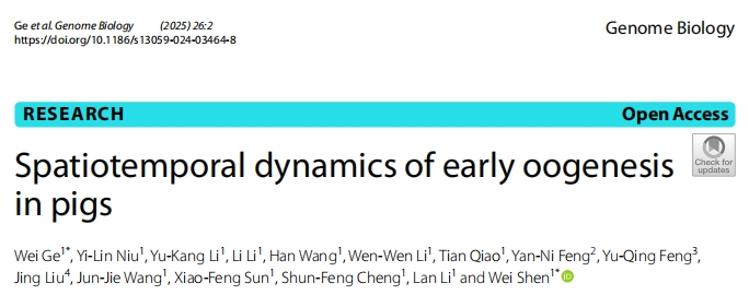 2025年1月,青島農(nóng)業(yè)大學葛偉教授與沈偉教授團隊在學術期刊《Genome Biology》上發(fā)表了一篇題為《Spatiotemporal dynamics of early oogenesis in pigs》的研究論文。該研究利用了單細胞RNA測序和空間轉(zhuǎn)錄組技術,解析了豬早期卵子發(fā)生中的基因表達及空間組織特征。研究發(fā)現(xiàn),豬生殖細胞在卵巢中呈“皮質(zhì)到髓質(zhì)”分布,且與人類卵子發(fā)生過程相似,表明豬是研究人類卵子發(fā)生的良好模型。RNA速度分析揭示了顆粒細胞譜系特征,空間共定位分析和細胞通訊分析顯示皮質(zhì)與髓質(zhì)區(qū)域生殖細胞與體細胞通訊模式不同,特別是NOTCH信號通路和ECM蛋白在調(diào)控中起關鍵作用,強調(diào)了卵巢微環(huán)境對生殖細胞命運的重要性。