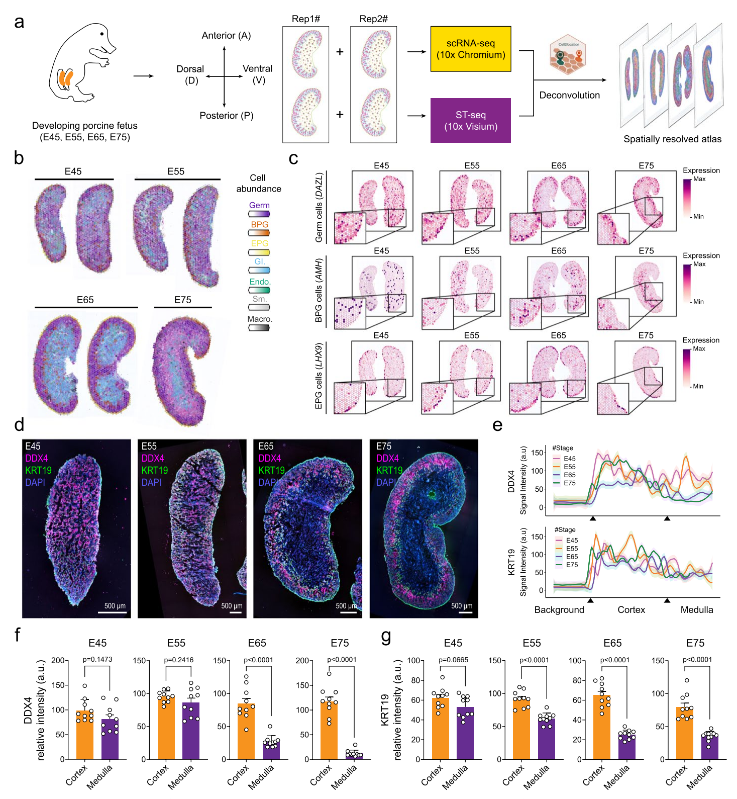 為進一步驗證分析結(jié)果,研究者進行了全組織染色實驗,使用生殖細胞標志物DDX4和前顆粒細胞標志物KRT19對E45至E75的胎兒卵巢進行染色,實驗結(jié)果與ST數(shù)據(jù)分析結(jié)果一致。此外,研究者還分析了這些陽性細胞在卵巢背腹軸上的空間分布,并通過熒光強度分析確認了生殖細胞和前顆粒細胞在皮層和髓質(zhì)區(qū)域的不同分布模式。這些發(fā)現(xiàn)為深入理解豬卵巢發(fā)育過程中細胞類型的空間動態(tài)變化提供了重要線索。