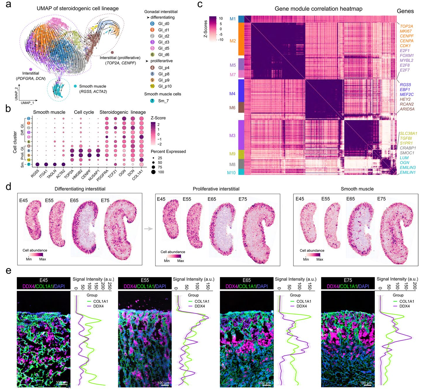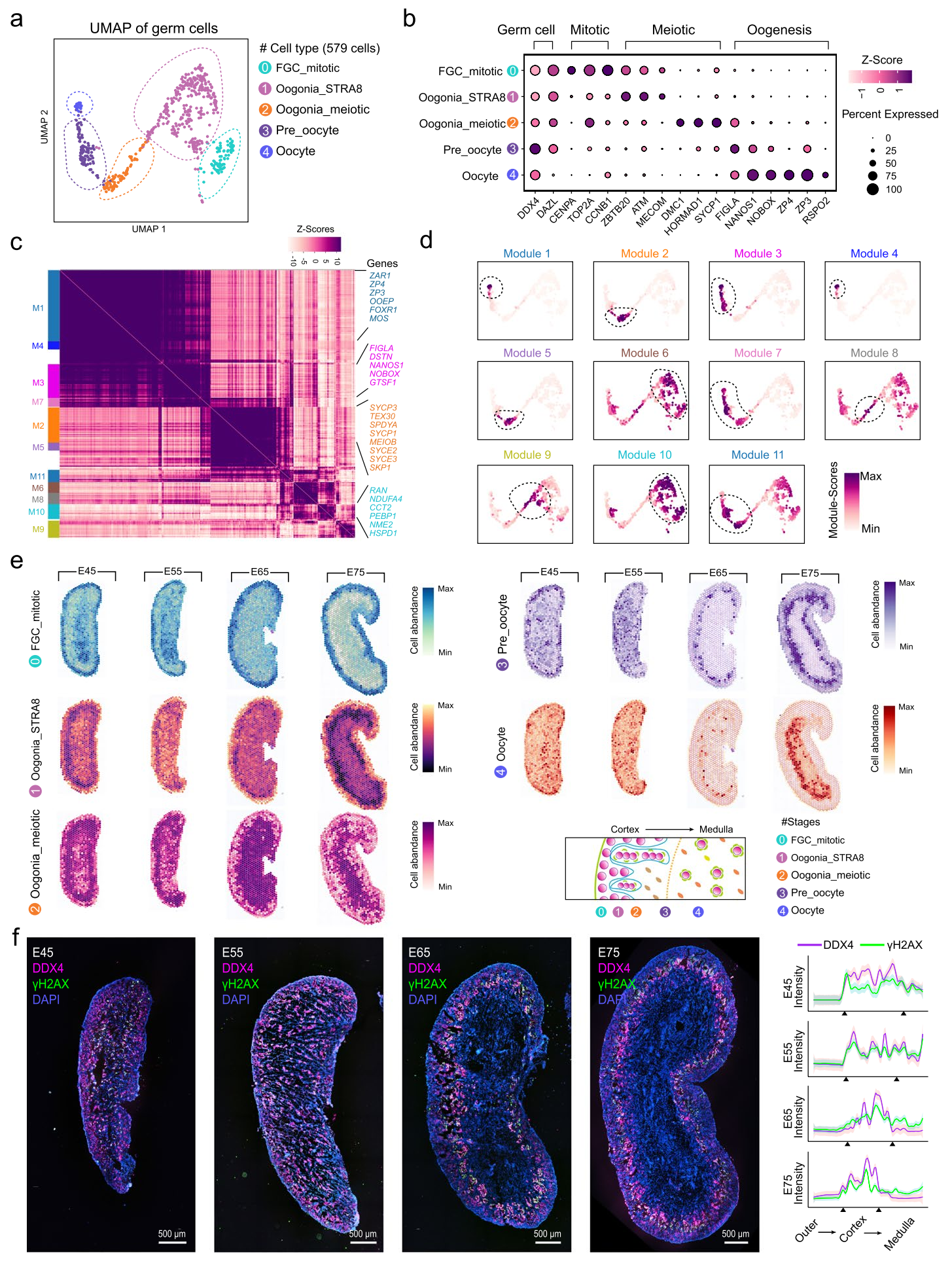 為了深入了解早期豬卵母細胞生成過程中模塊基因的功能富集情況,研究人員采用Hotspot算法,利用生殖細胞的scRNA-seq數(shù)據(jù)識別了相關基因模塊,共鑒定出11個功能各異的基因模塊。通過將單個模塊投影到UMAP圖中,確定了具有簇特異性的信息性基因模塊。剖析了早期豬卵母細胞生成過程中的基因表達譜后,研究人員進一步在空間環(huán)境中研究了這一過程。通過對ST芯片上的生殖細胞進行解卷積,揭示了早期卵母細胞生成的皮質(zhì)-髓質(zhì)梯度。為了驗證上述分析,研究人員使用生殖細胞標記DDX4和減數(shù)分裂生殖細胞細線期標記γH2AX進行了全組織染色實驗,以定位在不同階段啟動減數(shù)程序的生殖細胞。評估了C-M軸的熒光強度后發(fā)現(xiàn)在E45和E55卵巢中,γH2AX信號沿C-M軸的水平相似,而在E65至E75卵巢中,γH2AX信號在內(nèi)皮層達到峰值,在髓質(zhì)區(qū)域則減少。