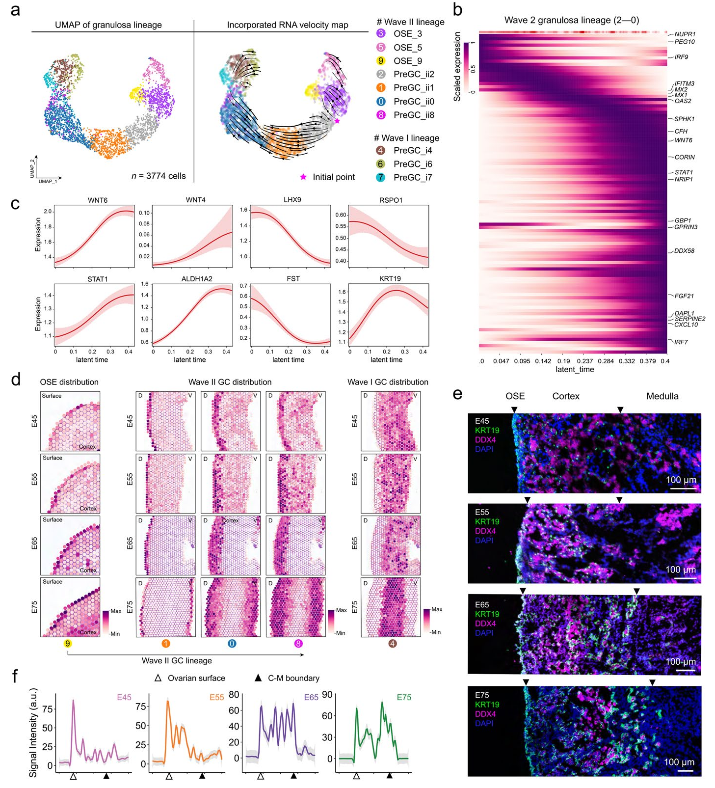 使用空間轉(zhuǎn)錄組學(ST)技術對wave I型顆粒細胞前體(PreGC_I)和wave II型顆粒細胞前體(PreGC_II)的標志性基因進行了空間定位。結(jié)果發(fā)現(xiàn),LHX9(PreGC_I的標志)和GREM1(PreGC_II的標志)的信號從E45到E75在卵巢中呈現(xiàn)特定的空間分布模式。在E65和E75,GREM1的信號明顯環(huán)繞著DDX4(生殖細胞的標志)的信號,表明卵巢卵泡組裝的早期階段,wave II型顆粒細胞(來源于皮質(zhì)區(qū)域的顆粒細胞前體)在卵巢卵泡組裝過程中發(fā)揮了關鍵作用。
