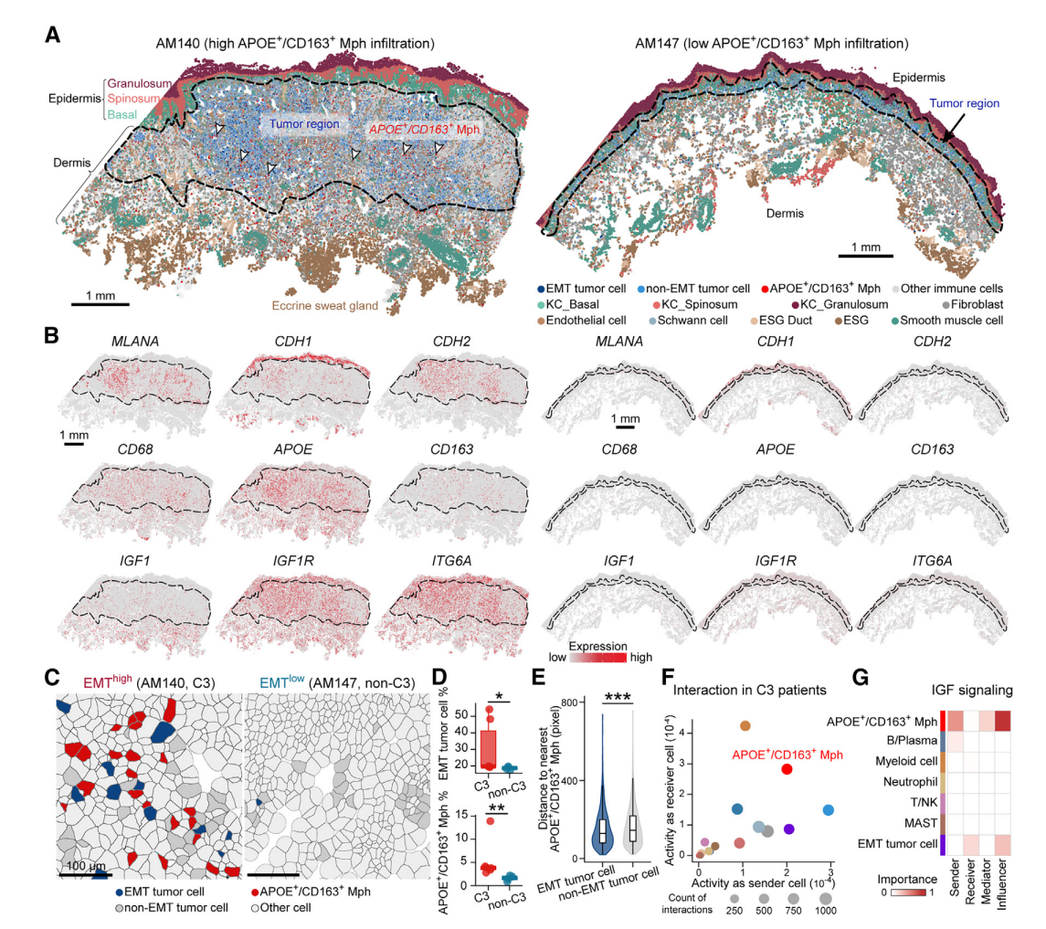 為在空間水平探究 APOE+CD163+ 巨噬細胞亞群與 EMT 腫瘤細胞的互相作用,研究人員利用百創(chuàng)S1000空間轉錄技術對10例 AM 樣本進行了實驗(數(shù)據(jù)中能夠明確區(qū)分表皮的基底層、棘層、顆粒層以及汗腺和血管,腫瘤區(qū)域高表達黑色素基因MLANA、PMEL、TYPR?和 DCT)。